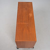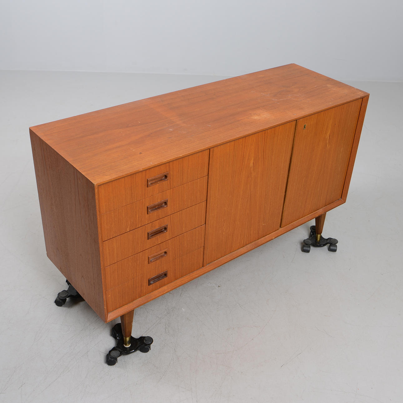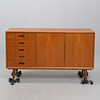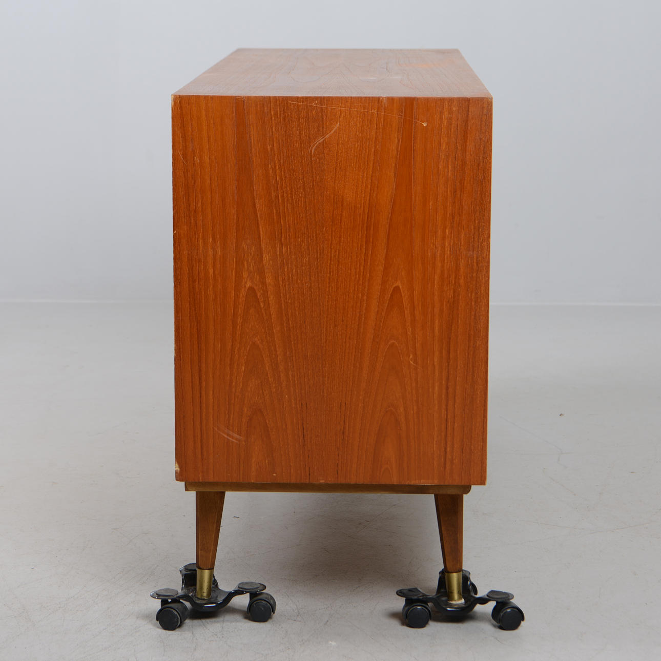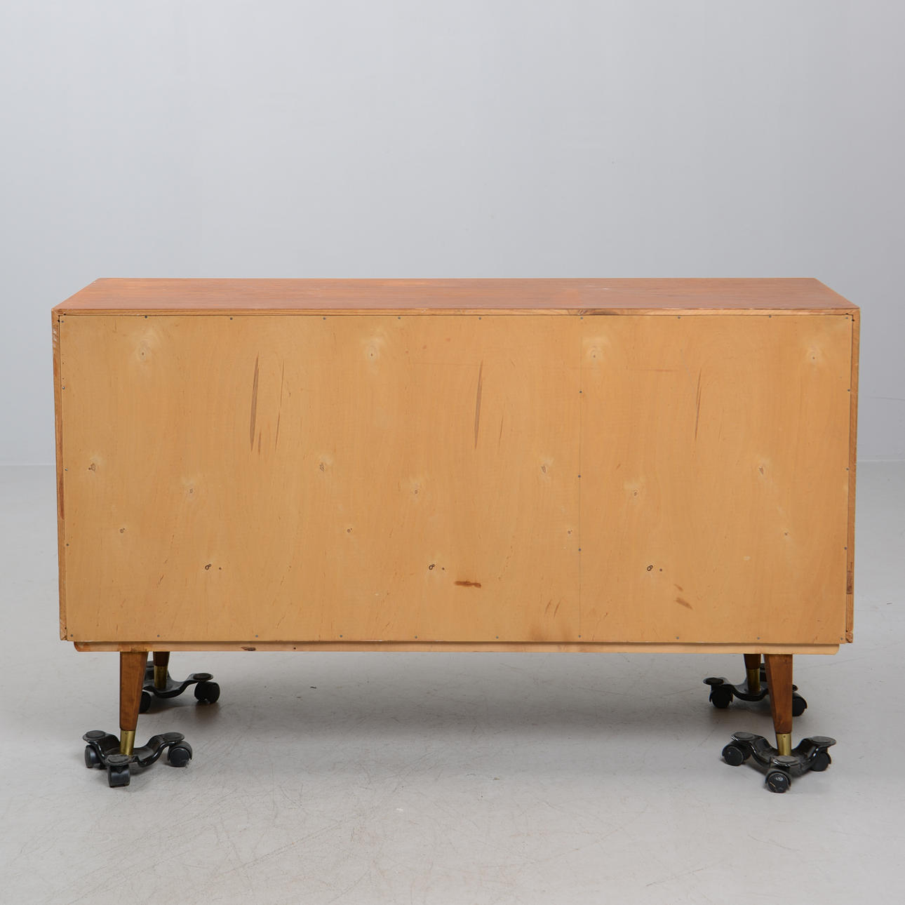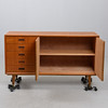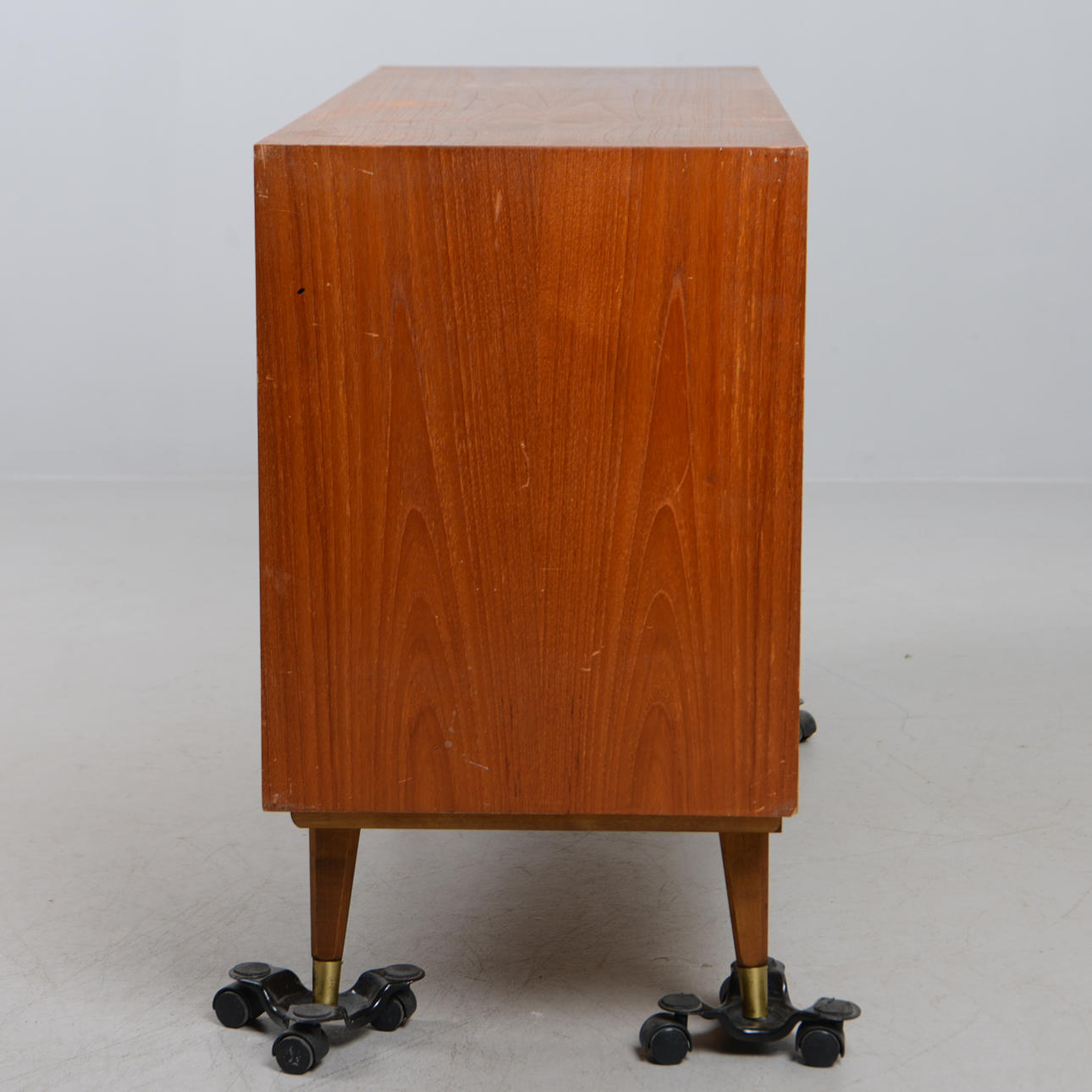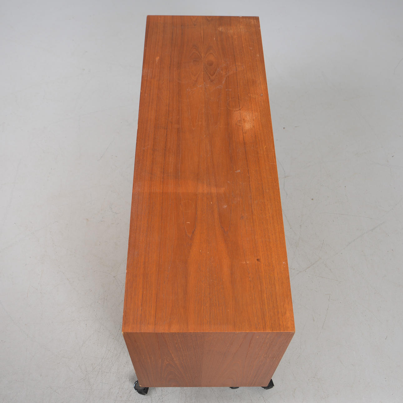 Skåpdel med bakomliggande hyllplan samt lådor. Längd 120 cm. Djup 41 cm. Höjd 70 cm.