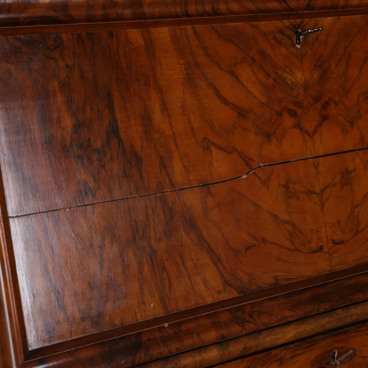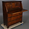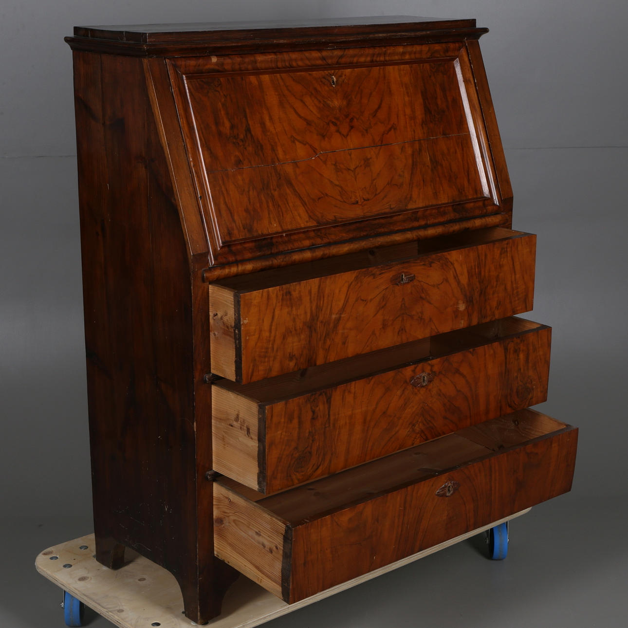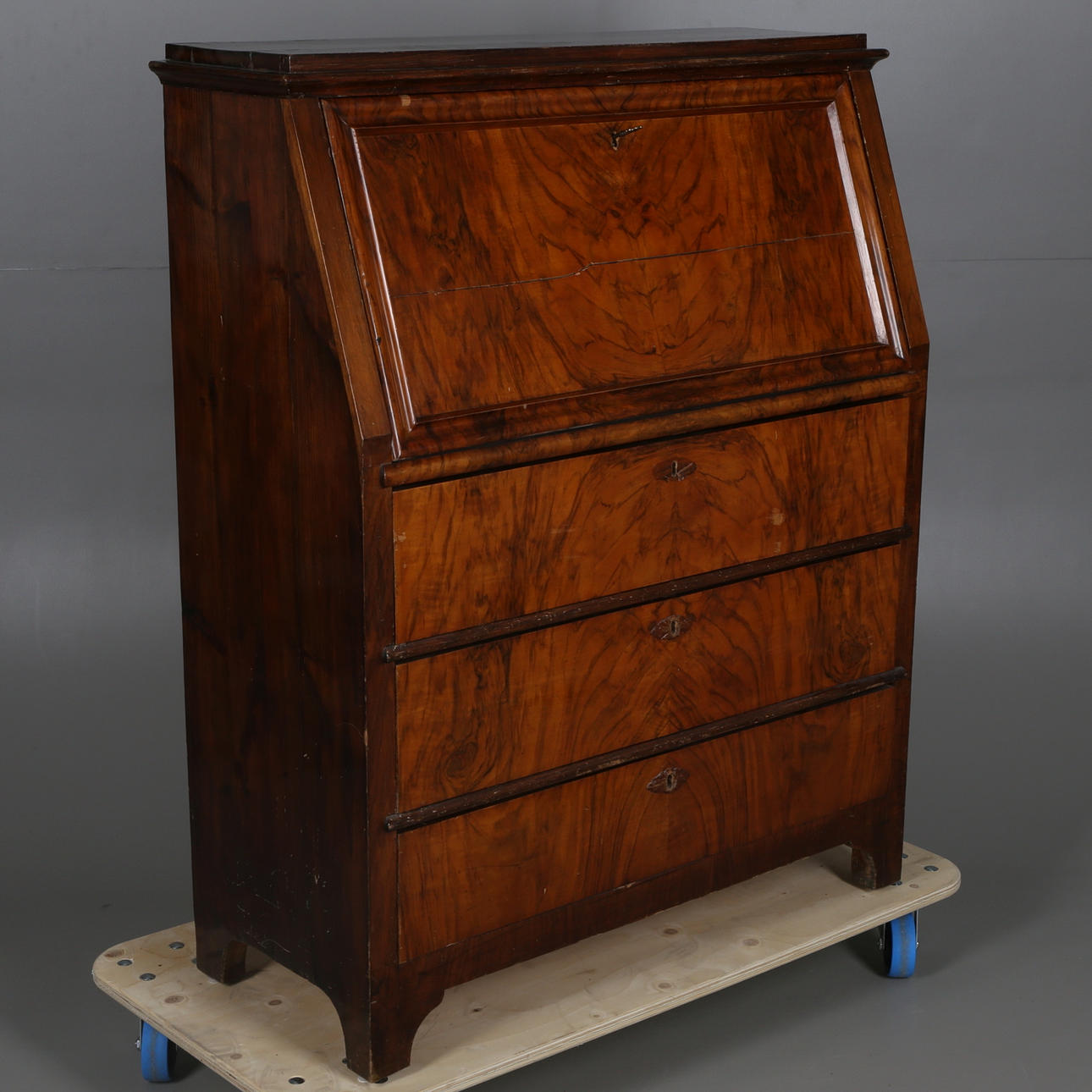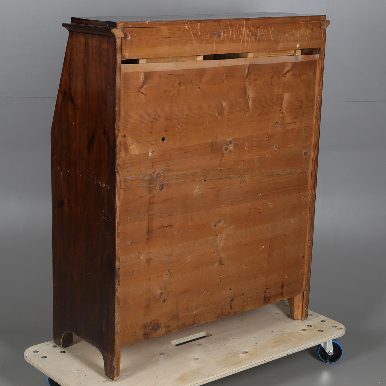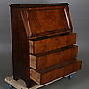 Bruksslitage, fläckar, skador, sprickor, fanérskador, ett träbeslag med betydlig skada, ett träbeslag borttaget (medföljer).