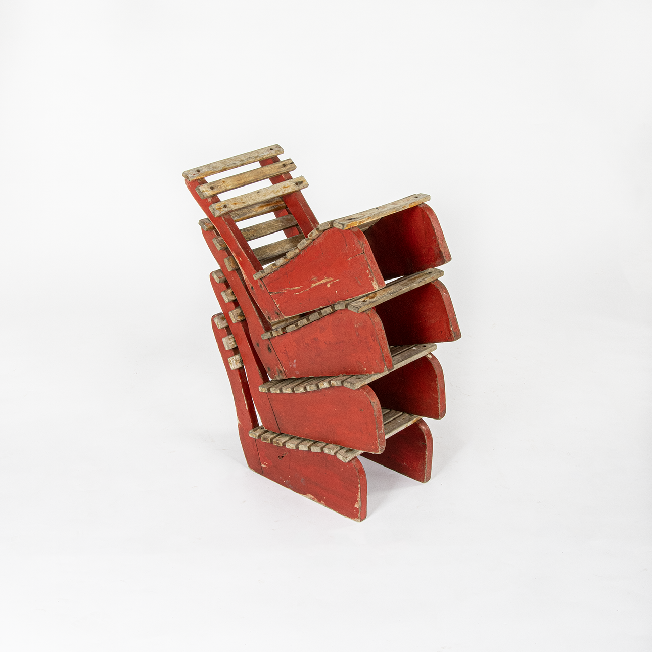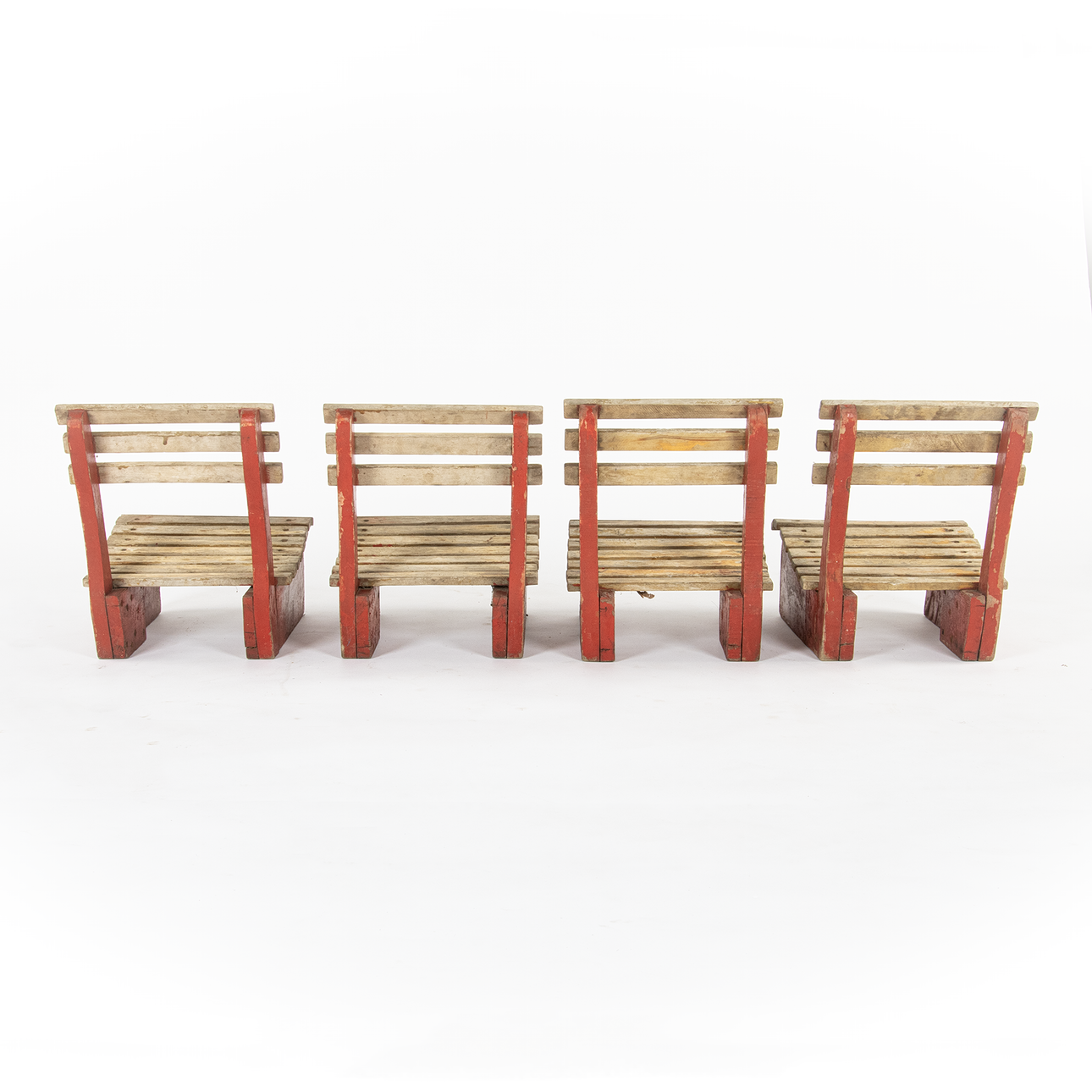 4 st mindre däckstolar, inredning till båtdäck, målat trä, 1920/30-tal Höjd 42 cm Sitthöjd ca 19 cm Bredd yttermått 34 cm.