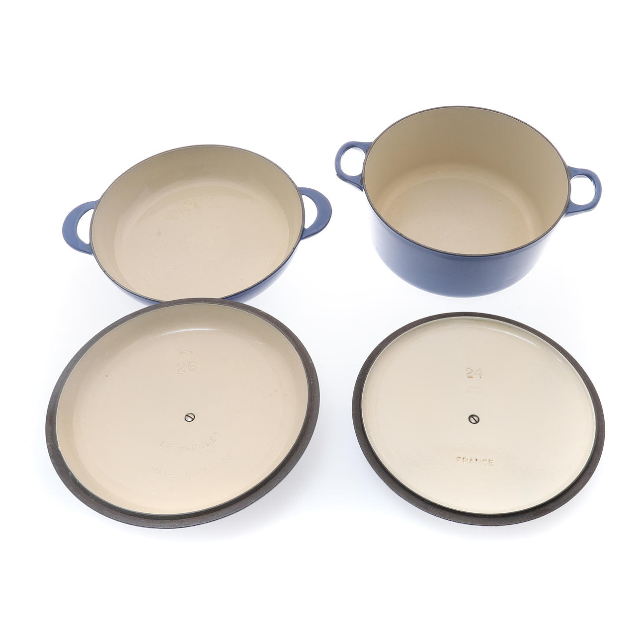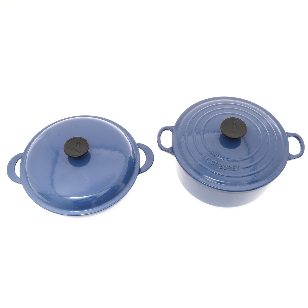 Det stegade locket med svart plasthandtag, 26 cm diameter x 11 cm högt, och en liknande Le Creuset grund gryta, 27 cm diameter x 6,5 cm hög.