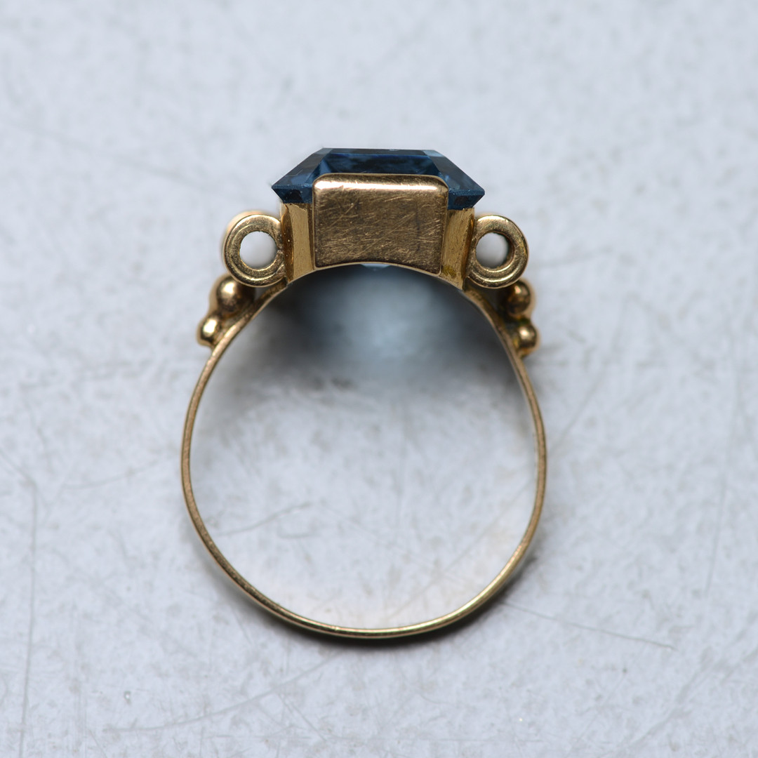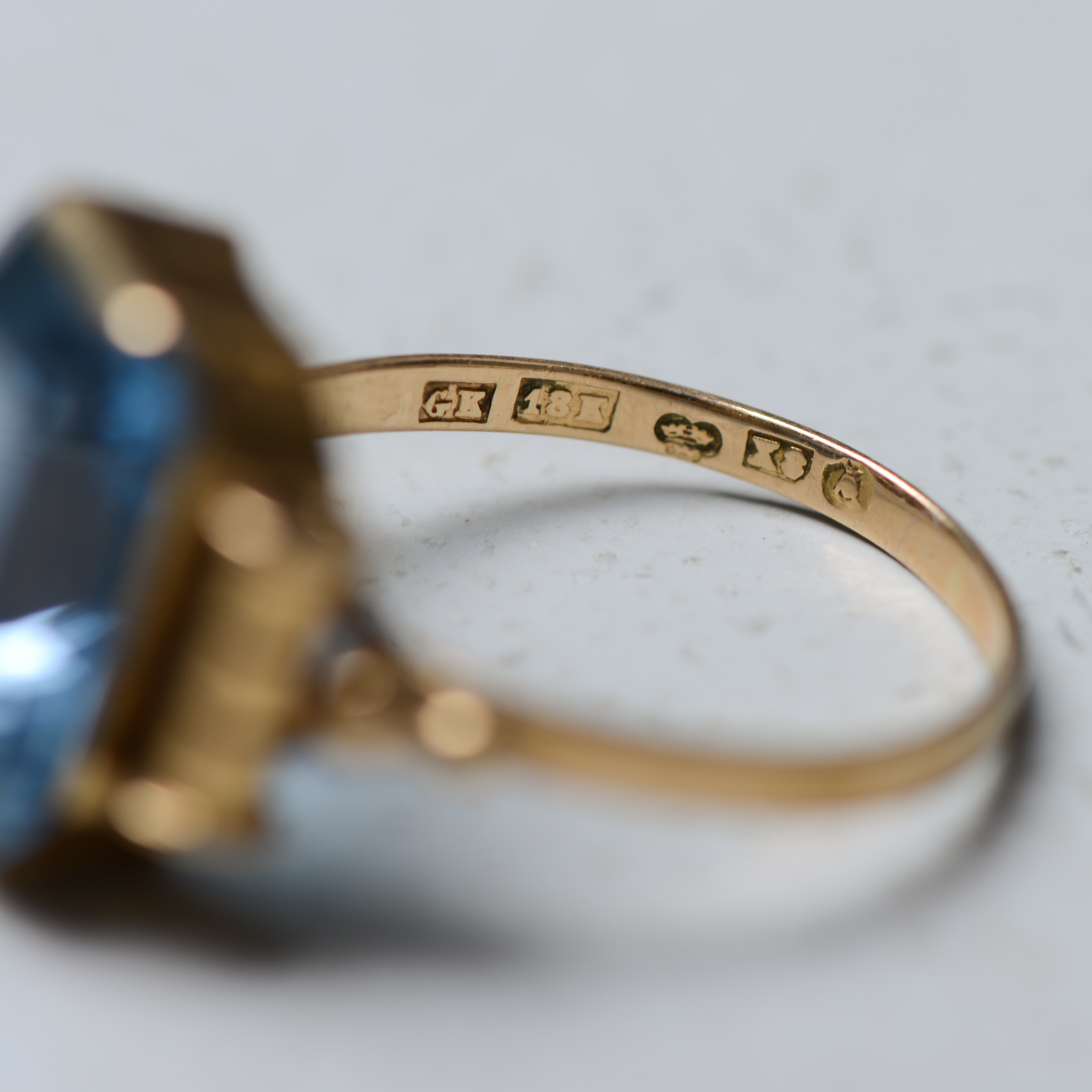 3124981. RING, 18K guld med ljusblå sten.