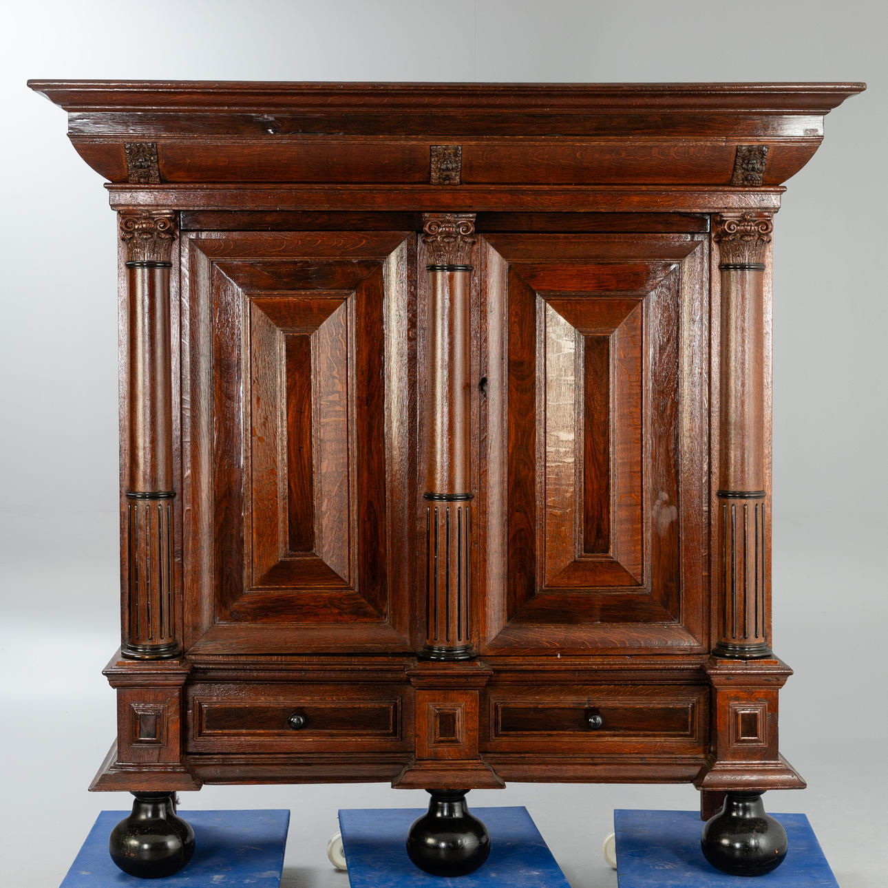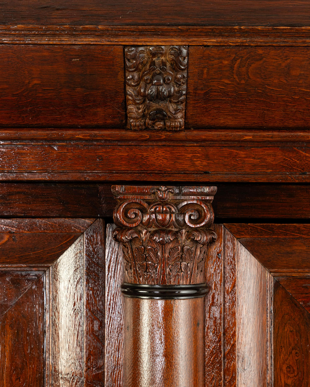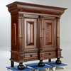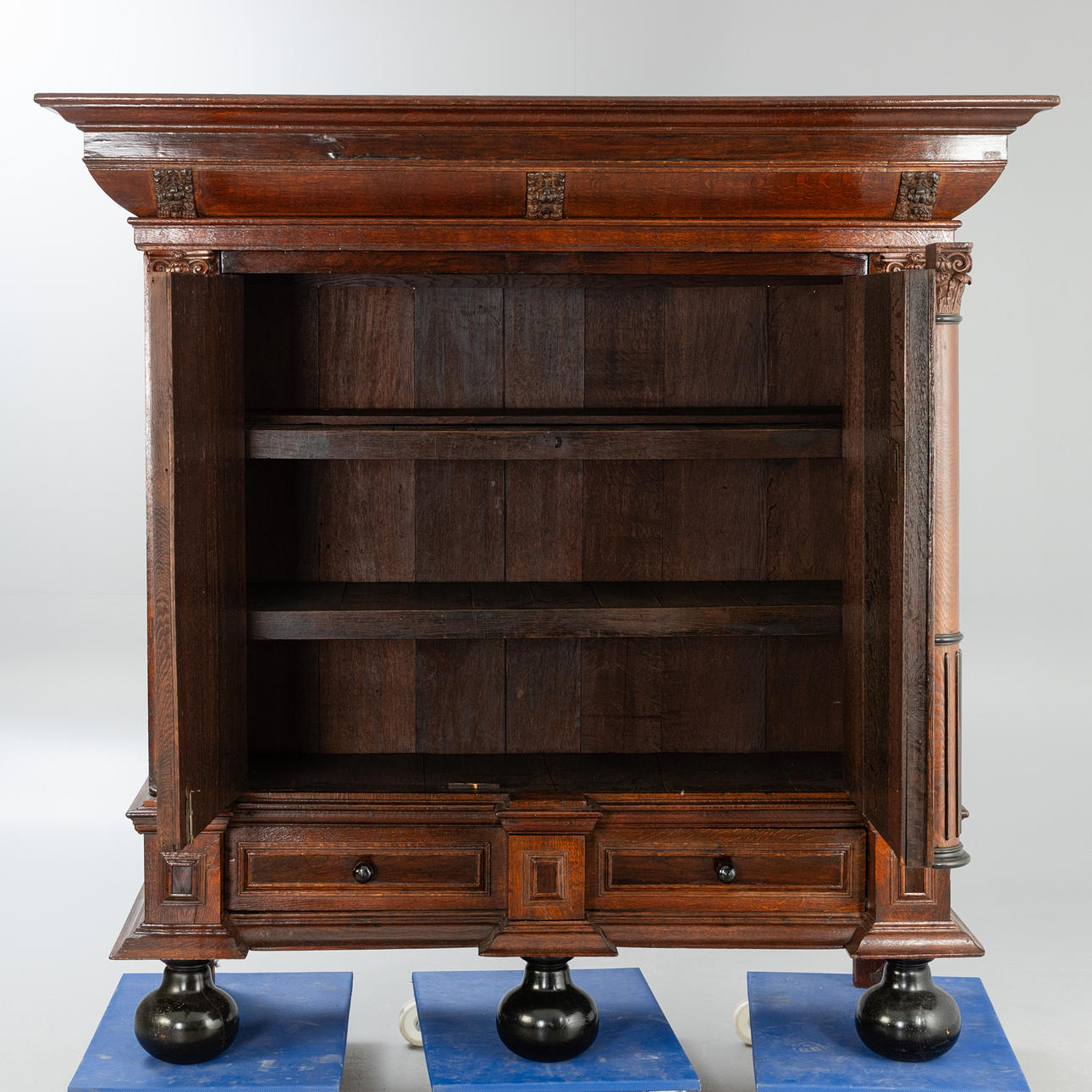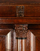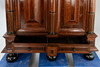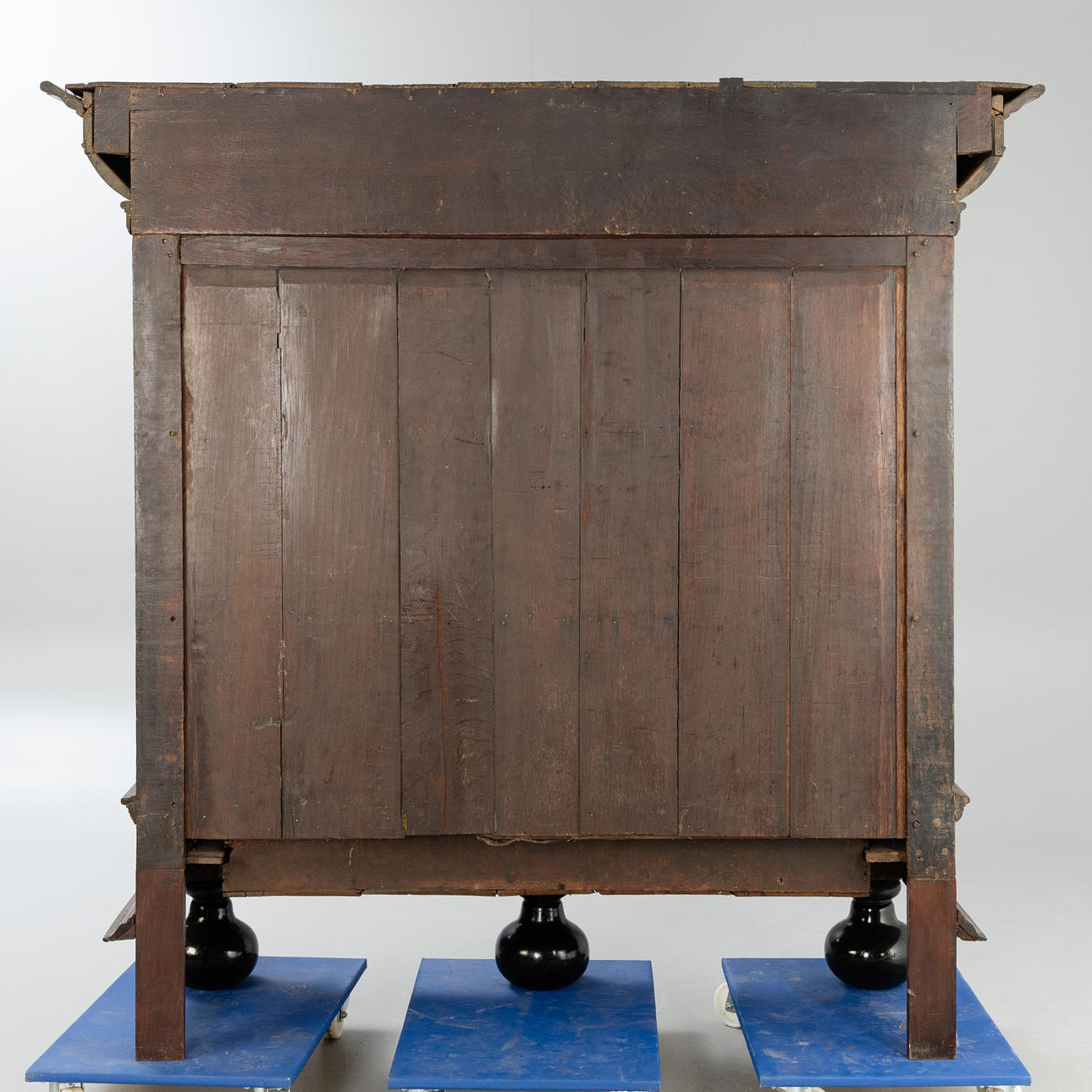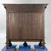 Kuddfyllningar i profilramar på de två dörrfronterna. Utskjutande pediment. Klipp dekorativa element och huvudstäder. HxBxD: ca. 183 x 190 x 70 cm.