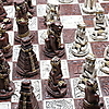 Pjäser, bräde samt detaljer i stenmassa, kanter till brädet i trä.