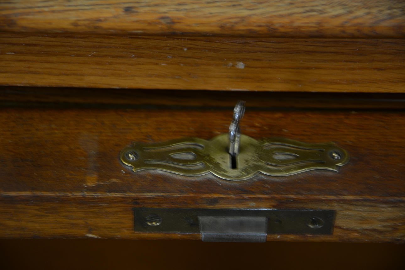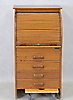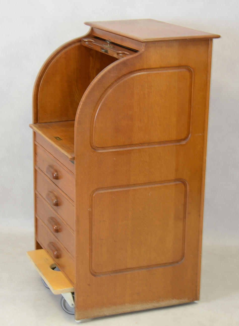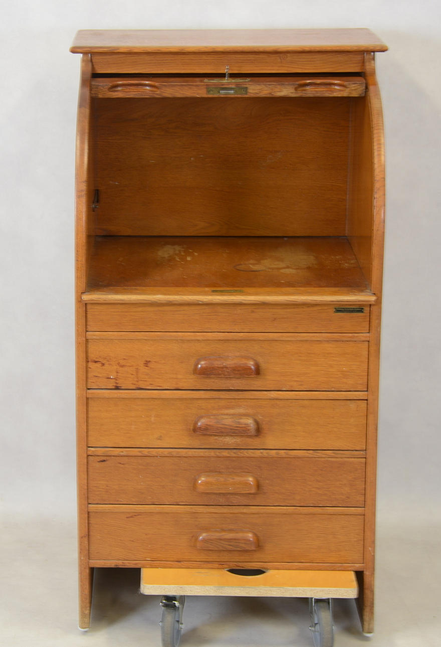 Ek. Skrivklaff bakom jalusi. Fyra lådor. Bredd 60, djup 55, höjd 100 cm. Utdragbar skrivskiva, tot djup 86 cm.