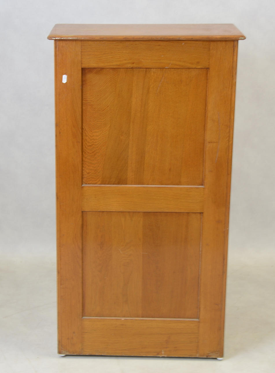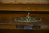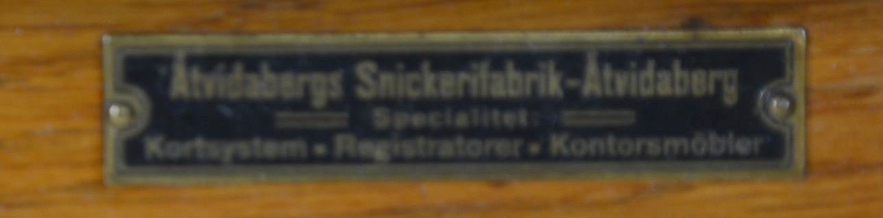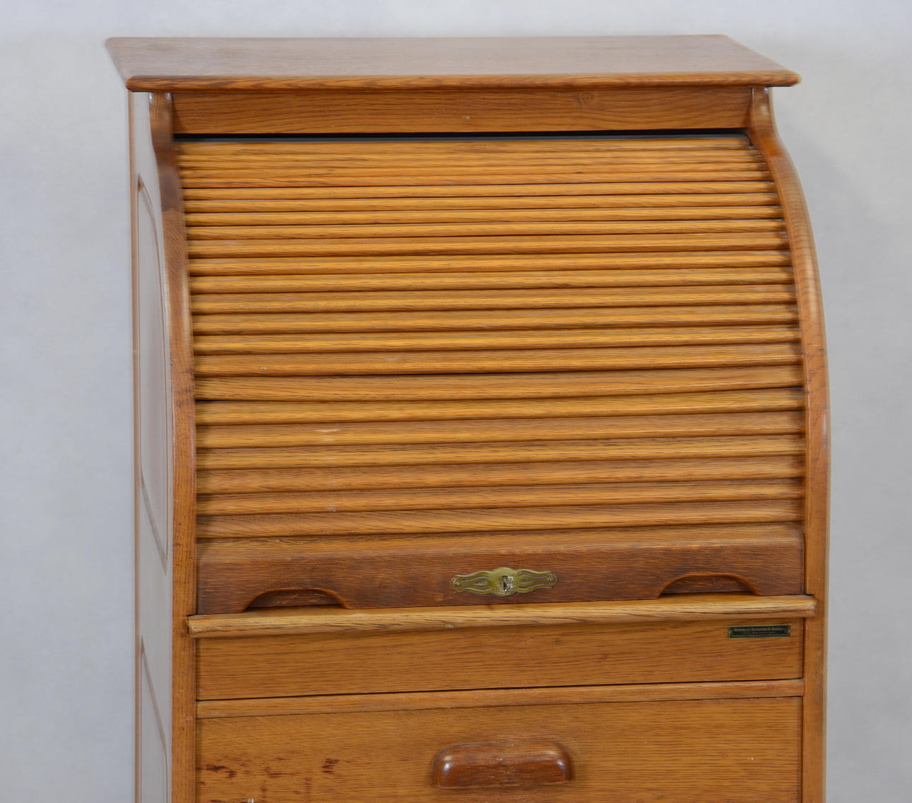 Ek. Skrivklaff bakom jalusi. Fyra lådor. Bredd 60, djup 55, höjd 100 cm. Utdragbar skrivskiva, tot djup 86 cm.