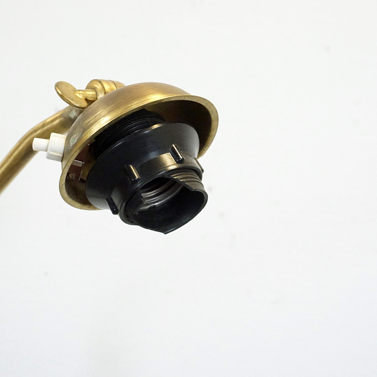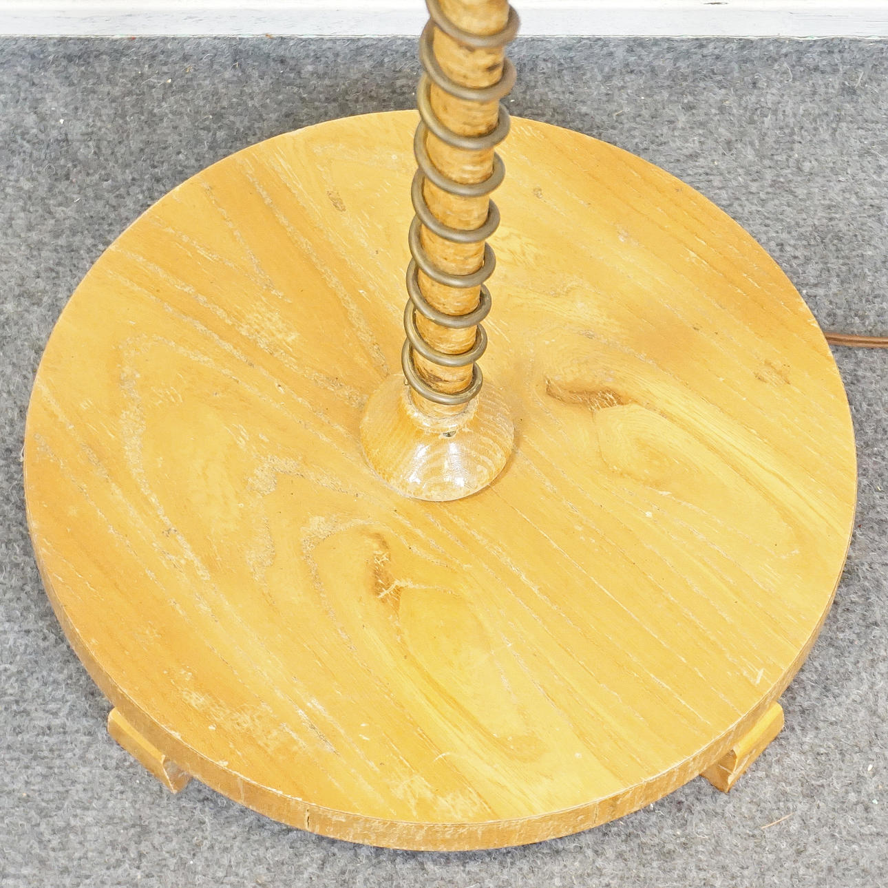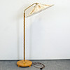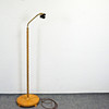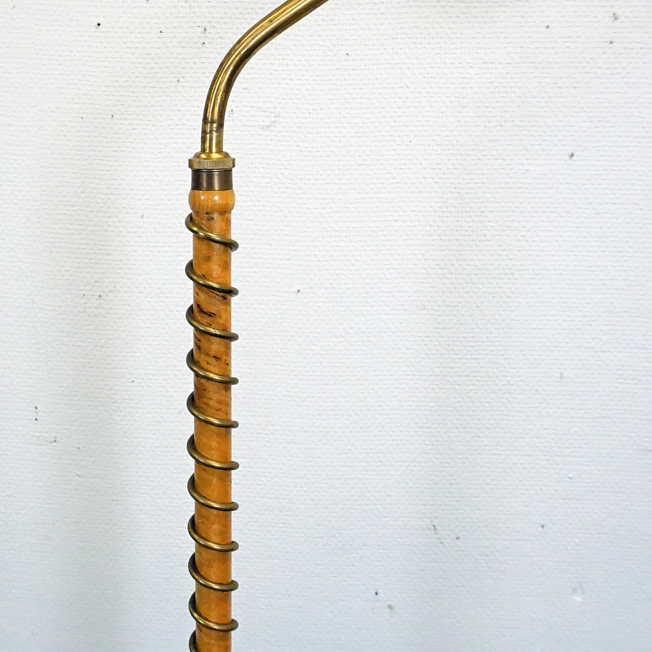 Trä och gulmetall. Höj- och sänkbar. Höjd 134 cm Fotens diameter 32 cm, skärmens diameter 63 cm.