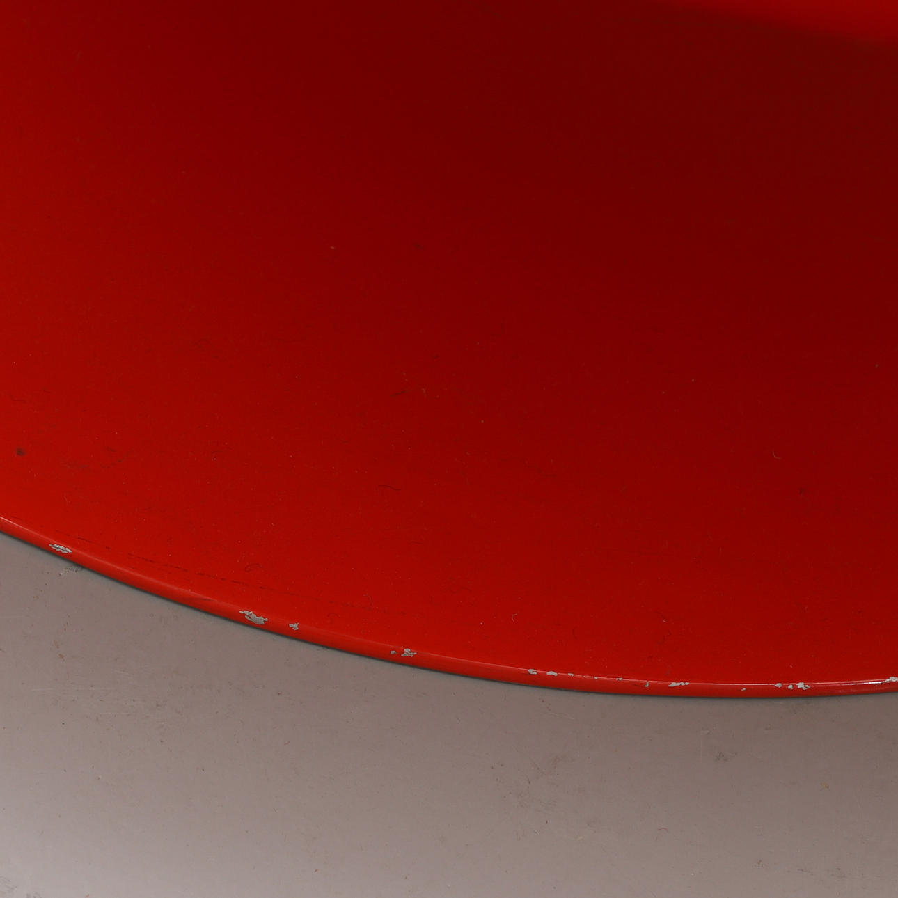 Formgiven 1963. Orangeröd glasfiber och rödlackerad aluminiumfot. Stoppad inredning med lös rygg- och sittdyna, klädd i röd textil. Bredd c:a 110 cm.