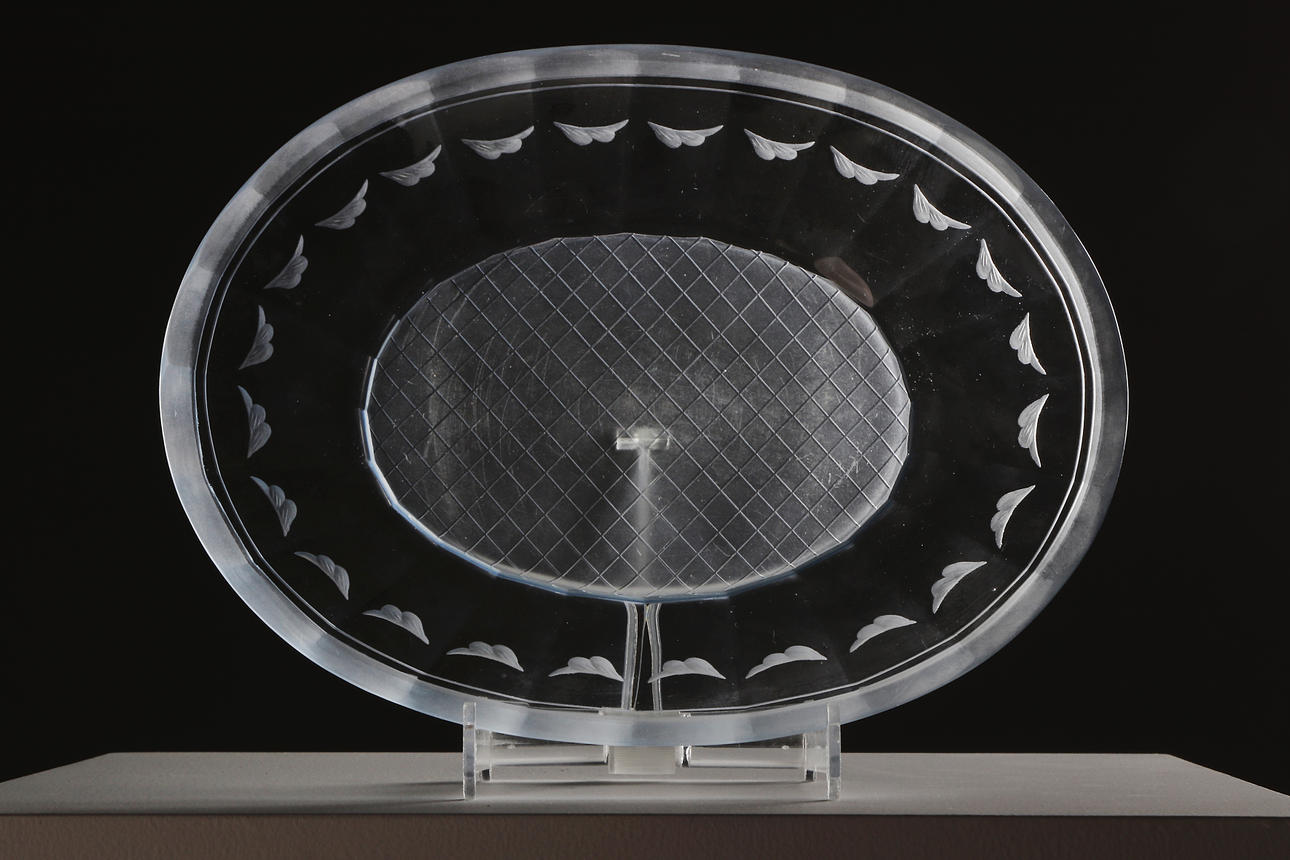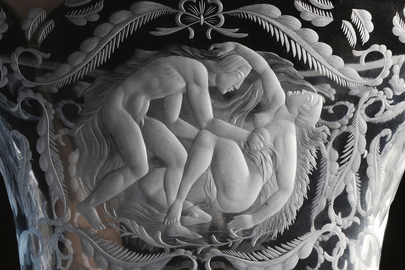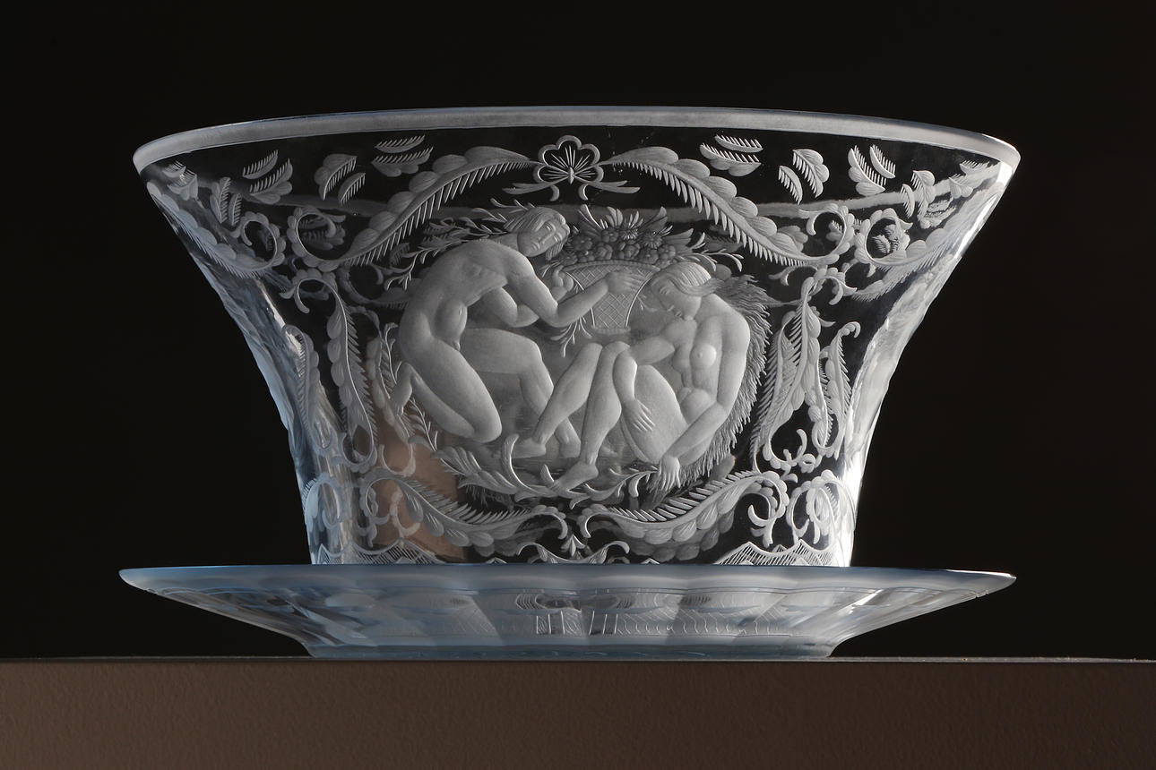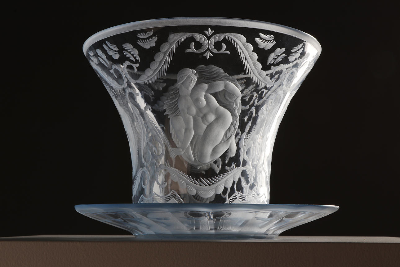 Blåtonat glas med slipad och graverad dekor. Signerad: Orrefors Gate 41 1928 R. Bayer.