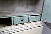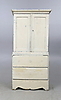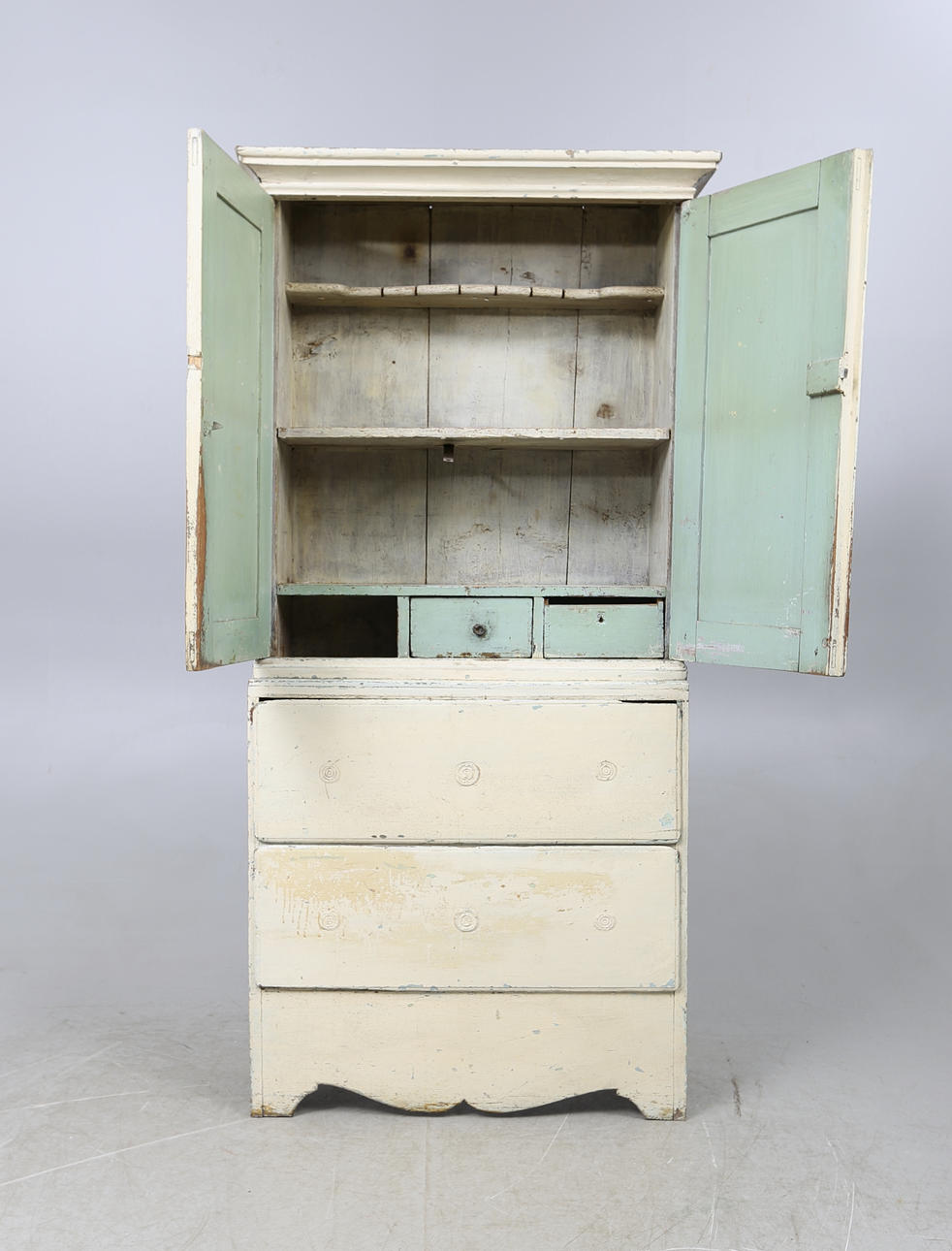 Vit/grönmålat. Underdel med två lådor. Överdel med två hyllplan varav en skedhylla samt två små lådor. Höjd 192 cm, längd 94 cm, bredd 34 cm.