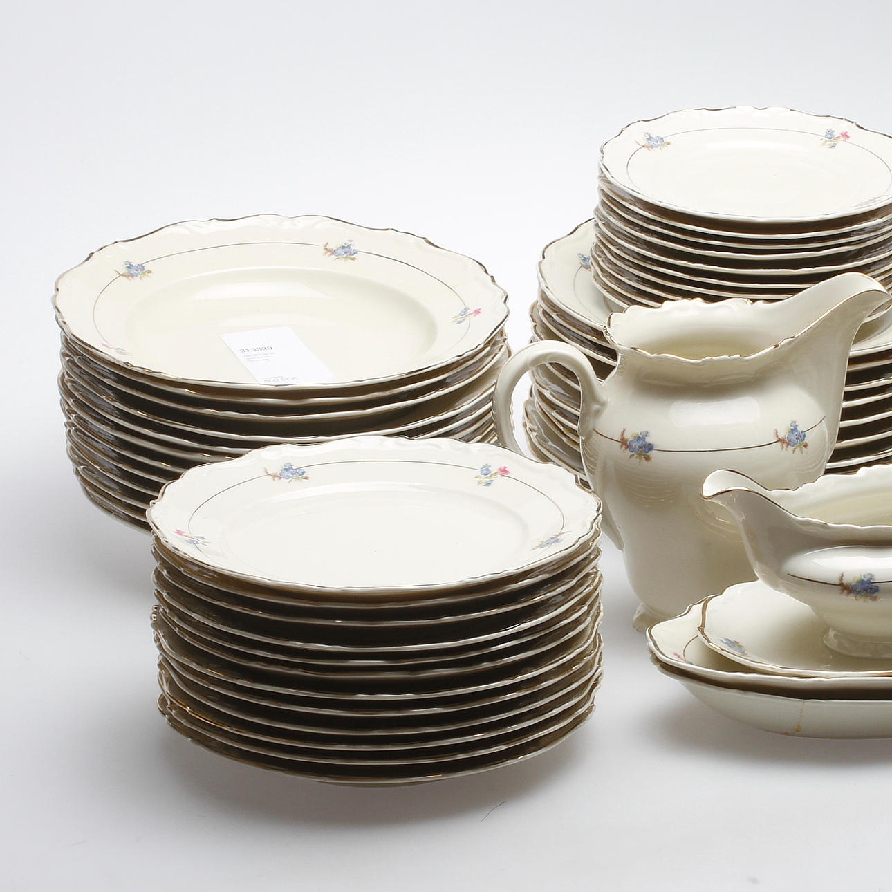 11 mattallrikar, 12 djupa tallrikar, 12+9 assietter, såsskål, kanna, 8 uppläggningsfat.