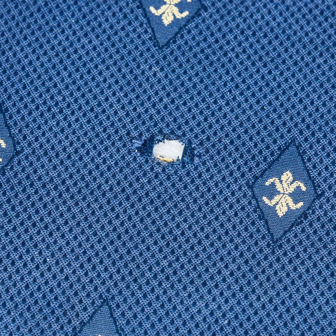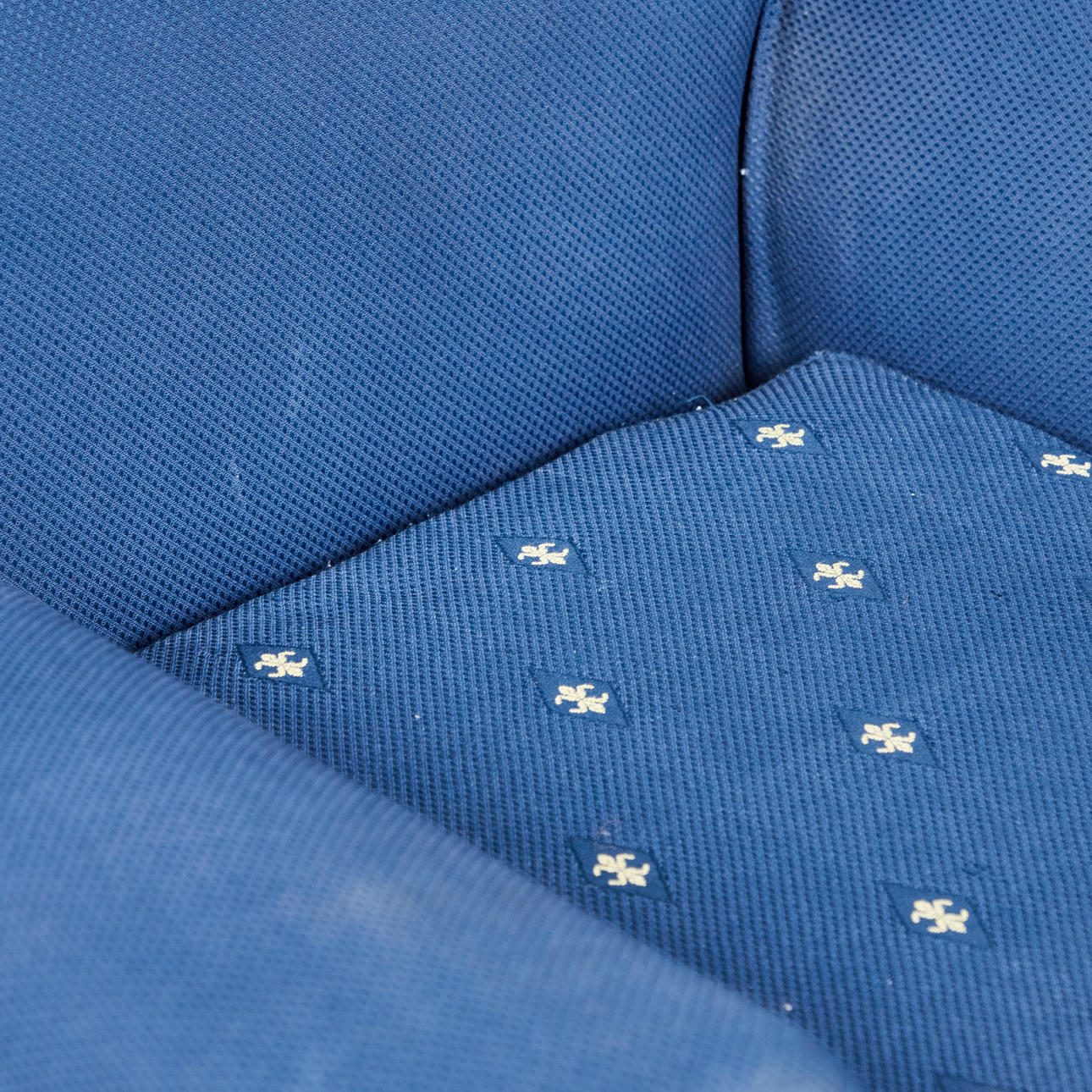 Åldersanpassade tecken på användning och gnidning, tyg med partiella fläckar, ett hål i sätesskyddet.