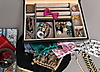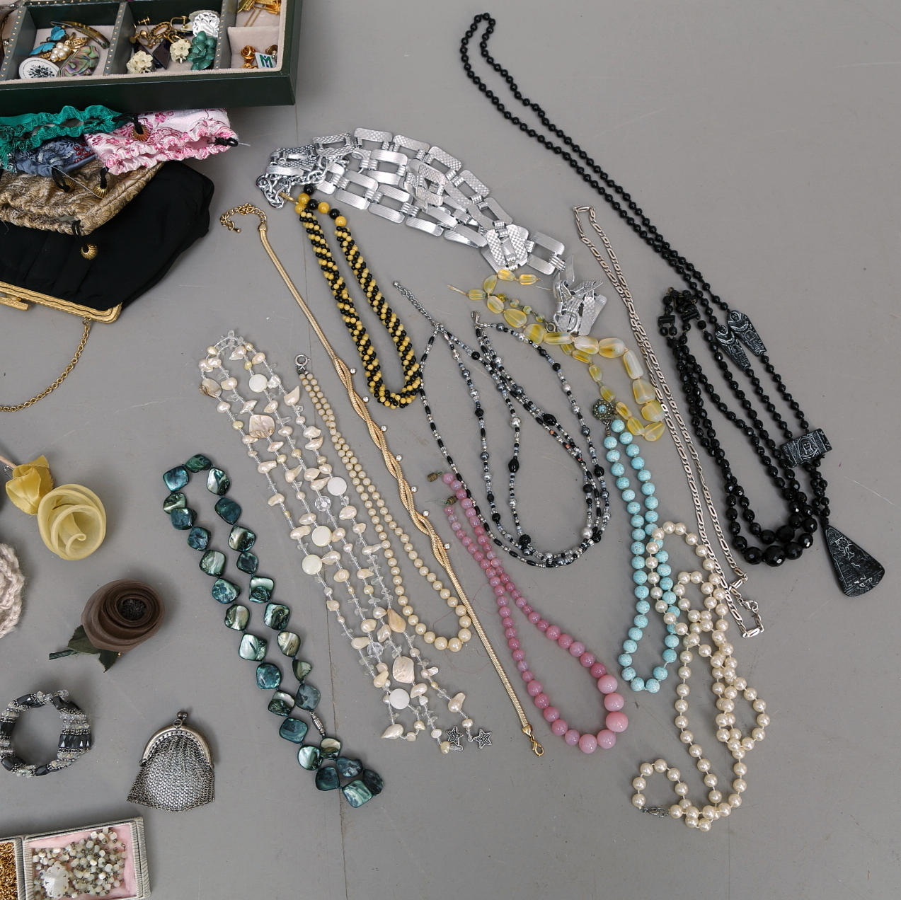 Halsband i olika material, broscher samt diverse småväskor, smyckeskrin mm.