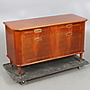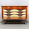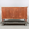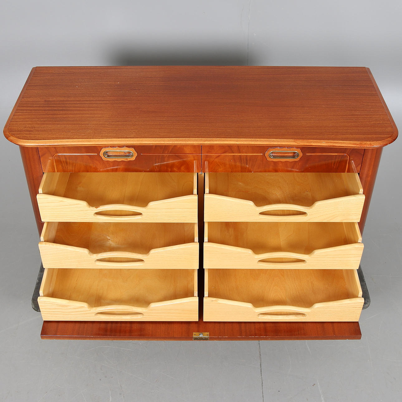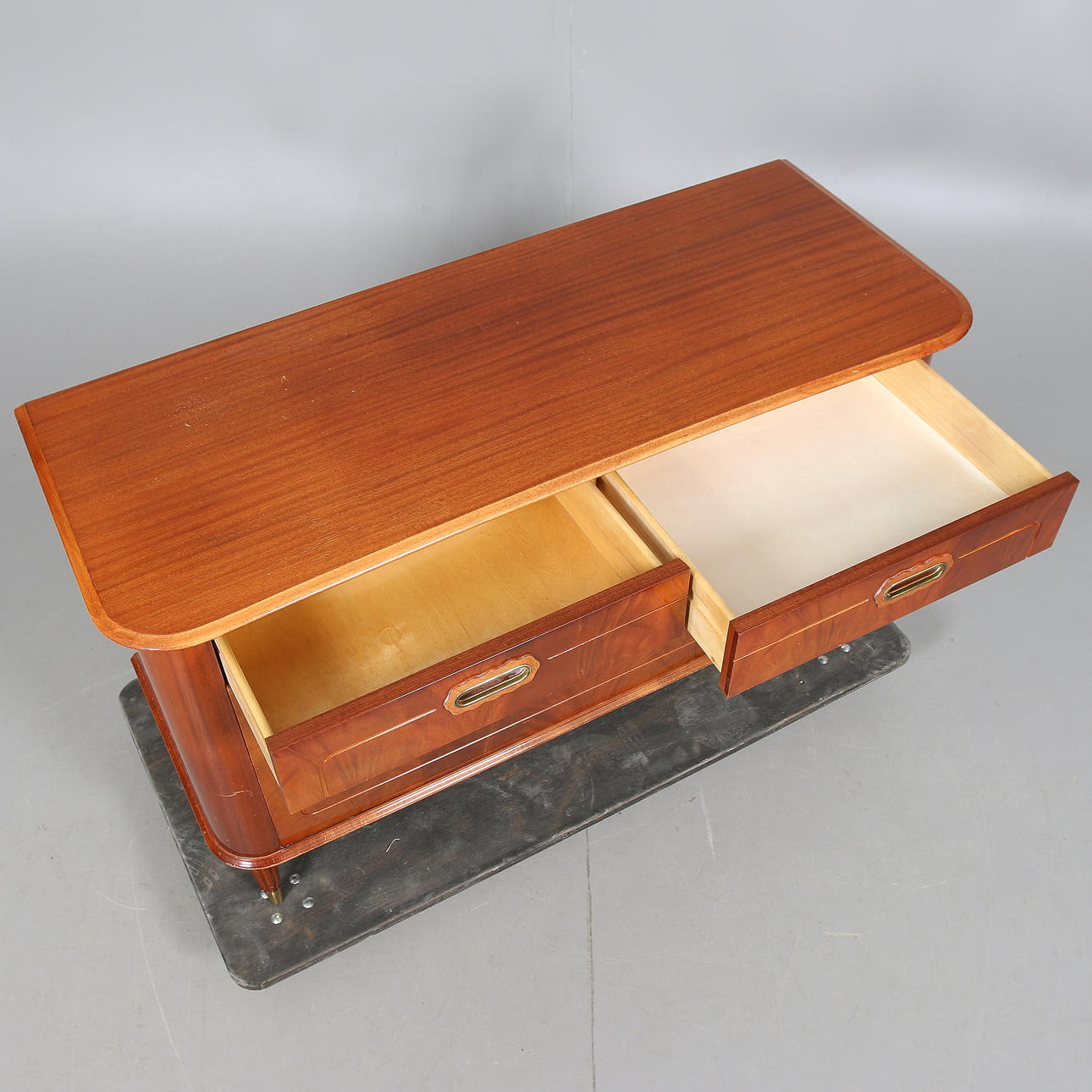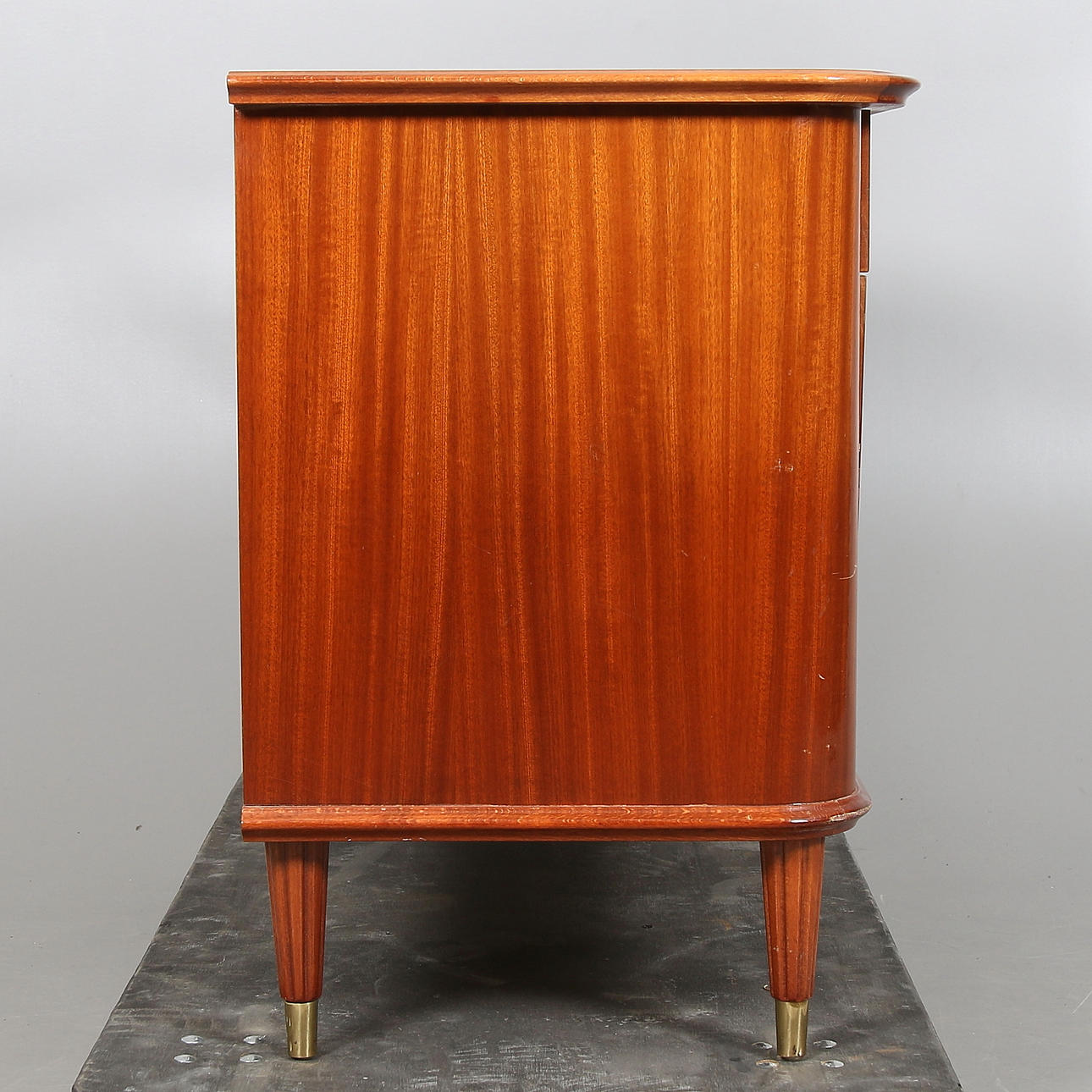 Mahogny. Nedfällbar klaff i framkant med bakomliggande lådor av björk. Bredd 114, djup 45, höjd 67 cm.