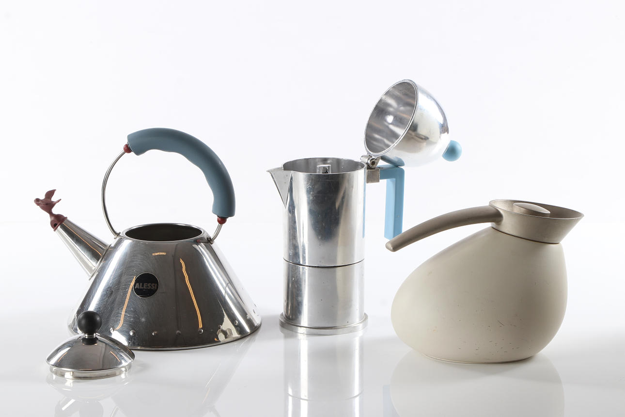 Alessi, perkulator samt tekanna och Georg Jensen, termoskanna. Höjd 16-29 cm.