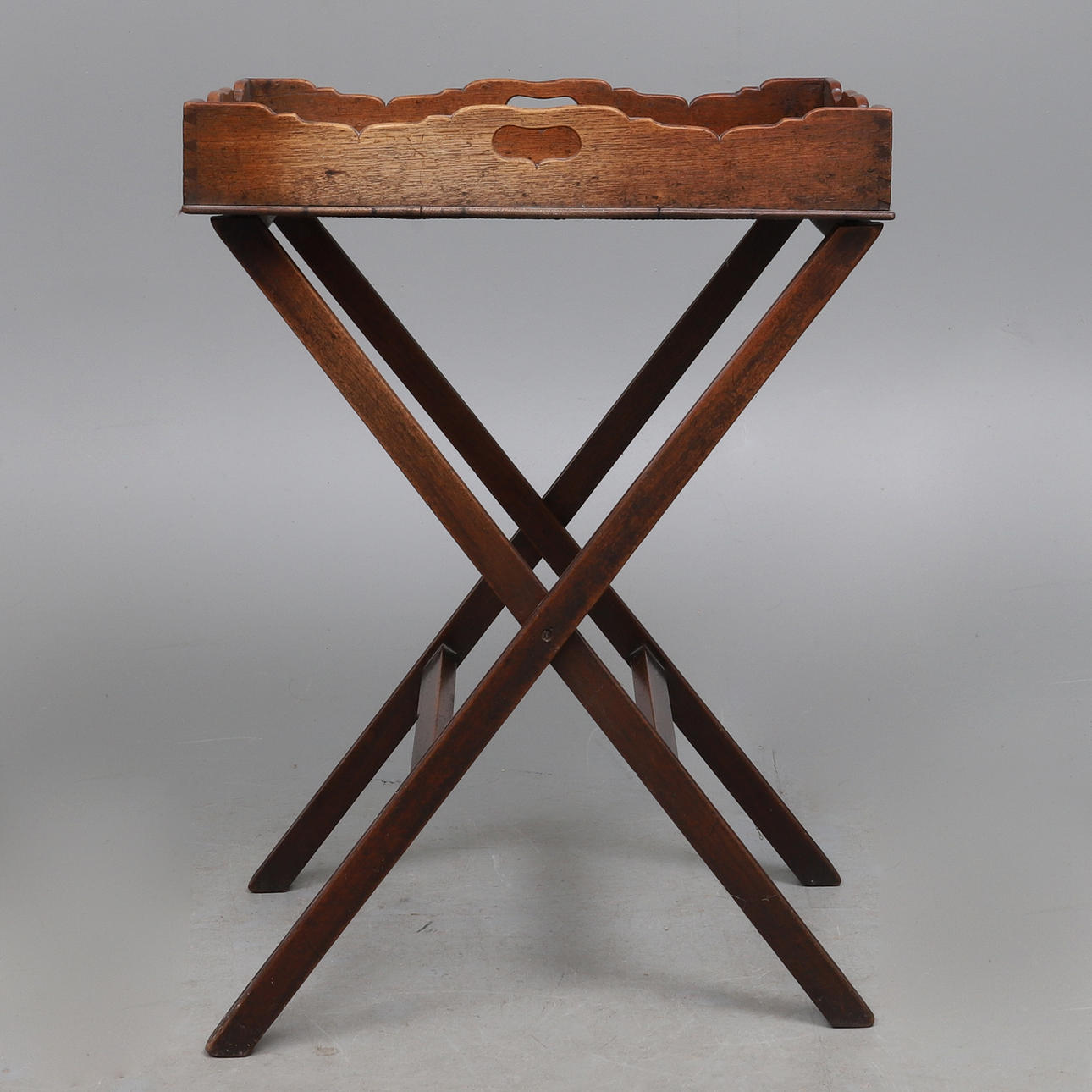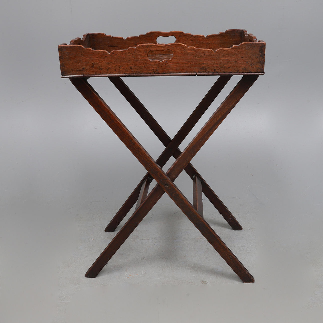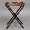 den böljande sidan med utskurna bärhandtag, 65 cm x 46 cm x 10 cm, på ett tillhörande edwardiansk mahognyfällbart stativ ”x” -format (2)