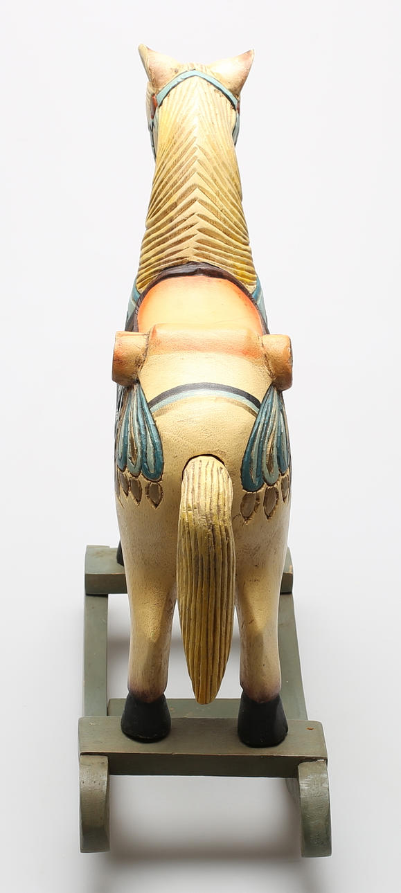 trä, ljust målade, avtagbar svans, Höjd 46cm Längd 41cm Bredd 15cm.