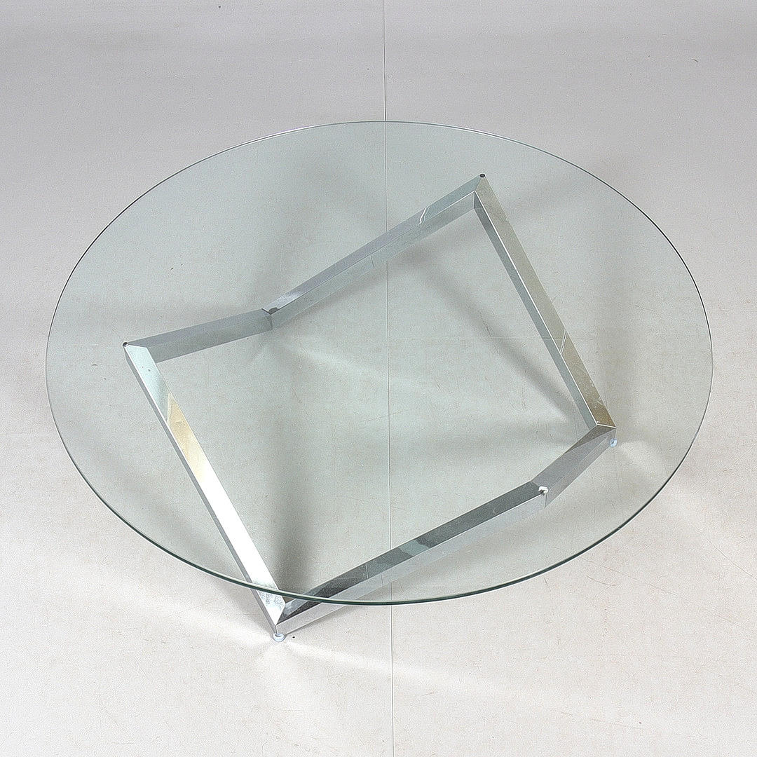 Underrede av förkromad metall. Rund bordsskiva av härdat glas.
