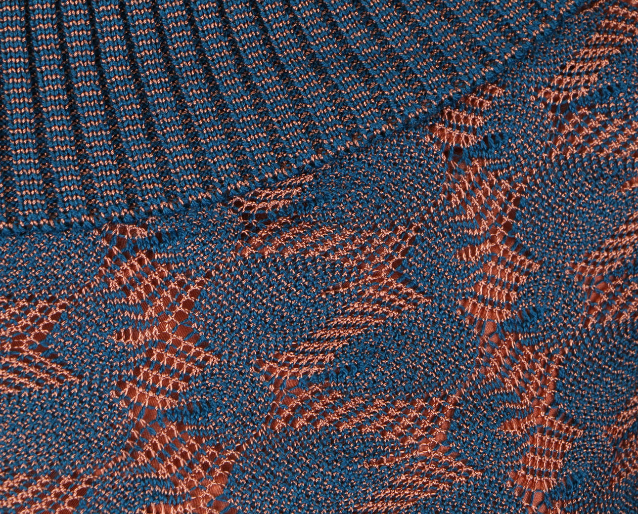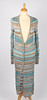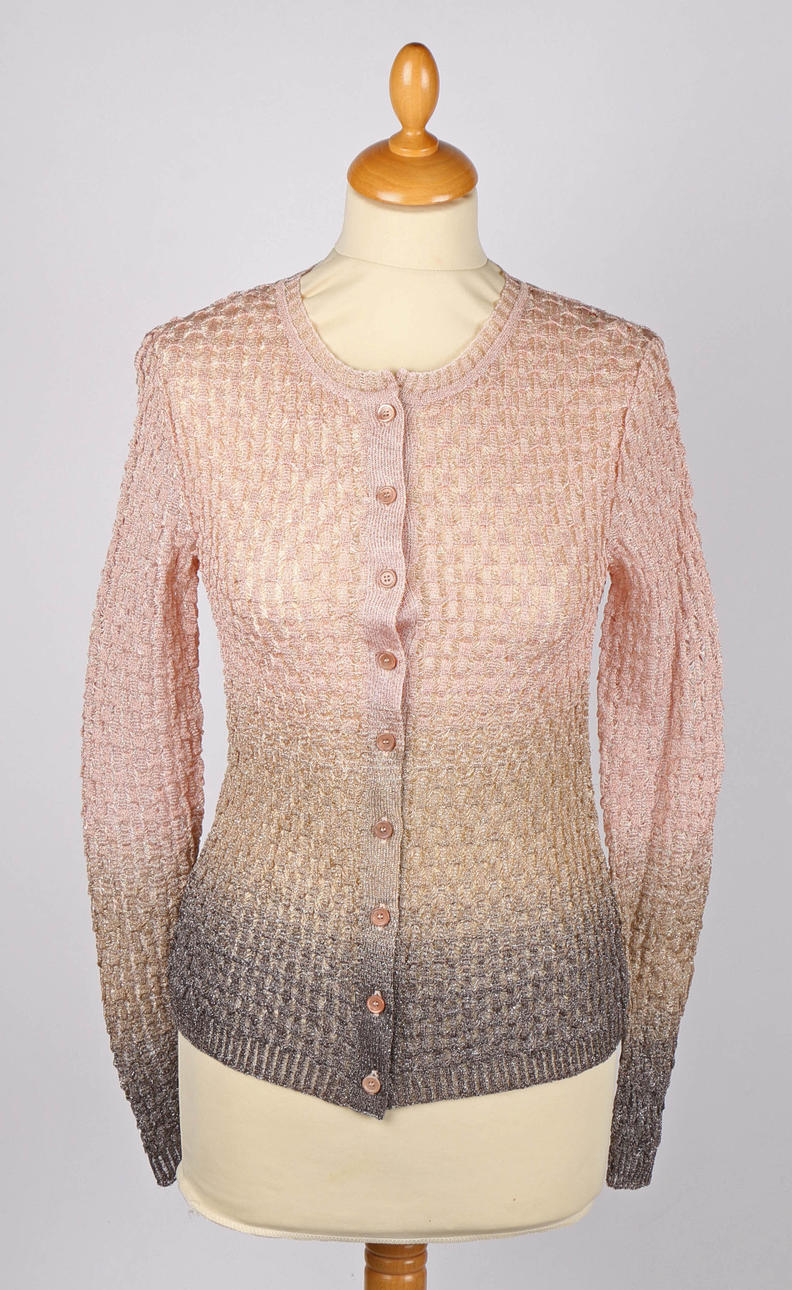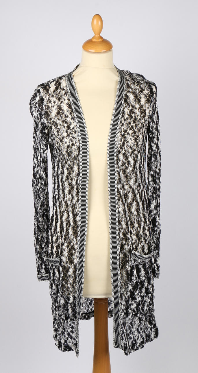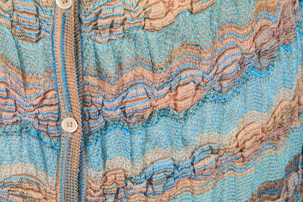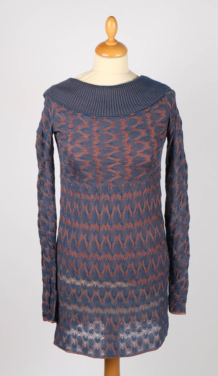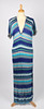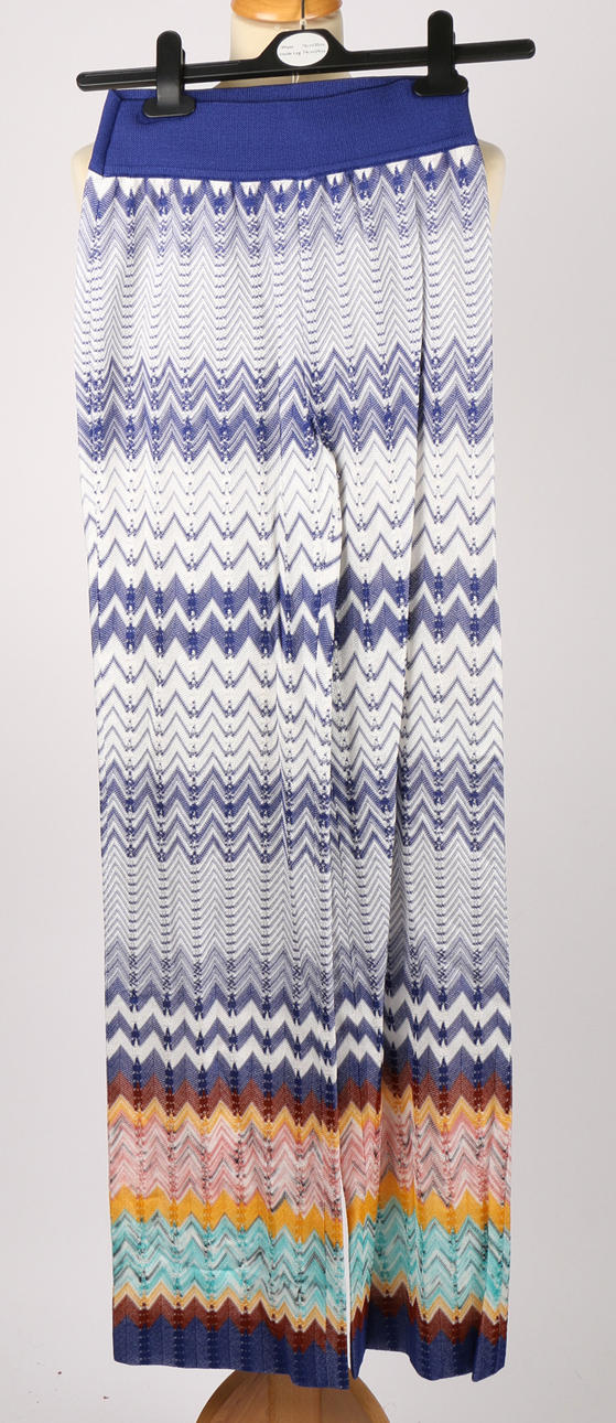 Sex stycken Missoni-kläder, inklusive en svartvit kofta, en lång blå klänning v-ringad klänning, ett vitt, blått och brunrandigt par breda byxor, en långärmad pastellfärgad kofta, en rosa/grå kofta, en marinblå långärmad miniklänning med brunt foder och en v-ringad randig topp (7).