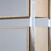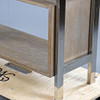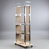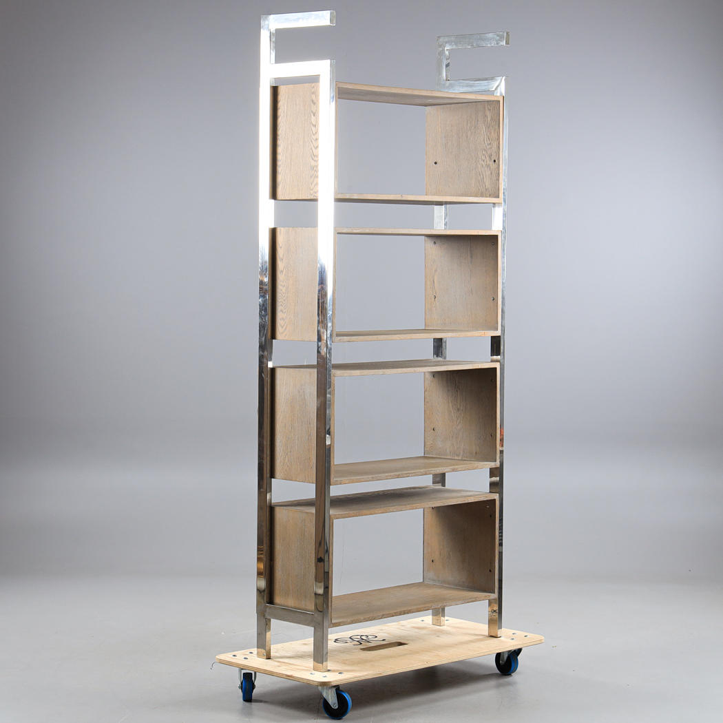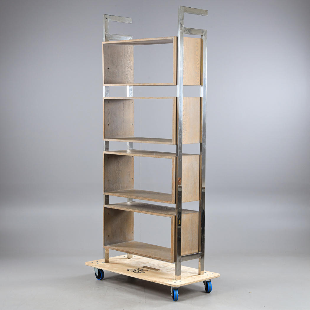 Stomme i blankpolerad metall, hyllsektioner i behandlat trä, höjd ca 230x95 cm.