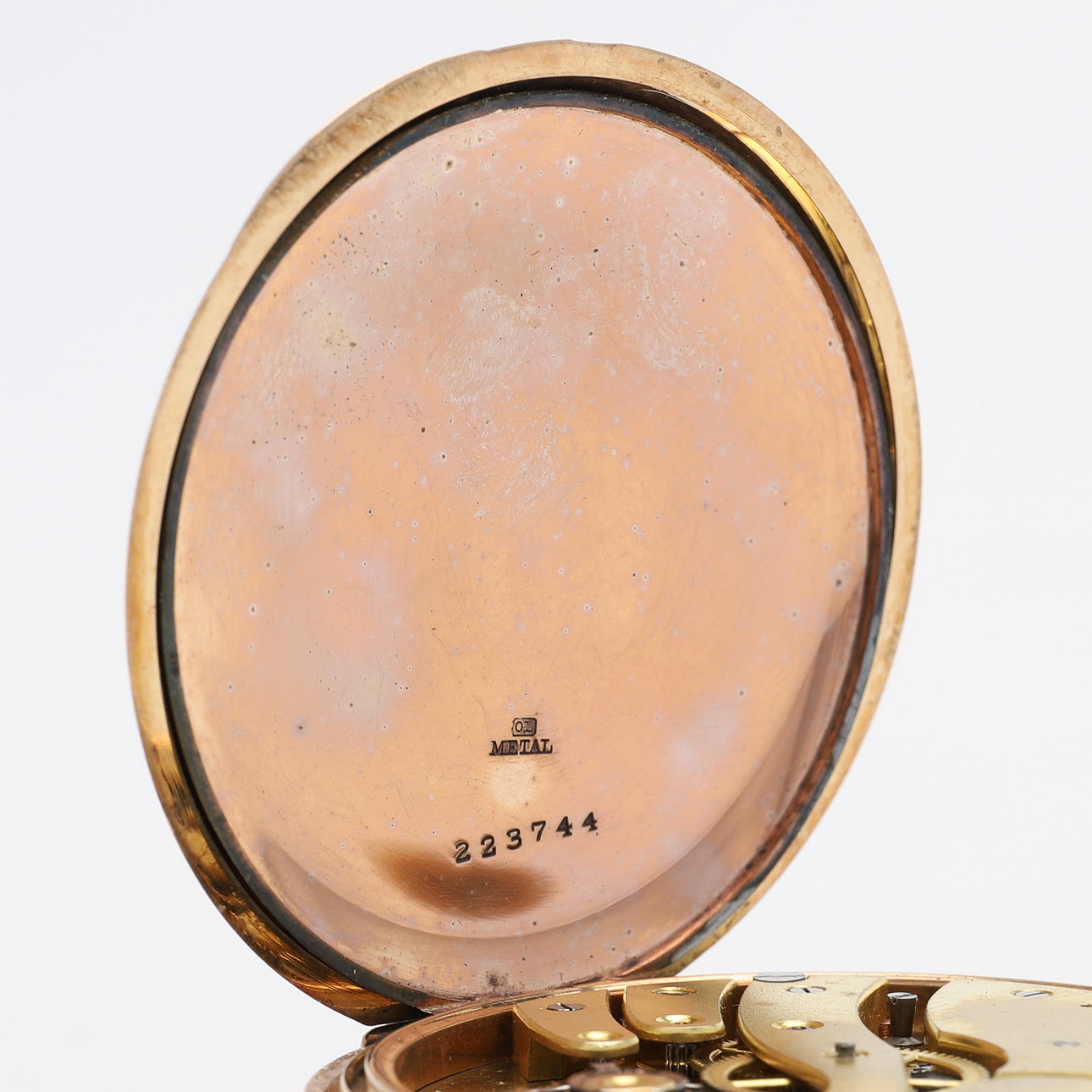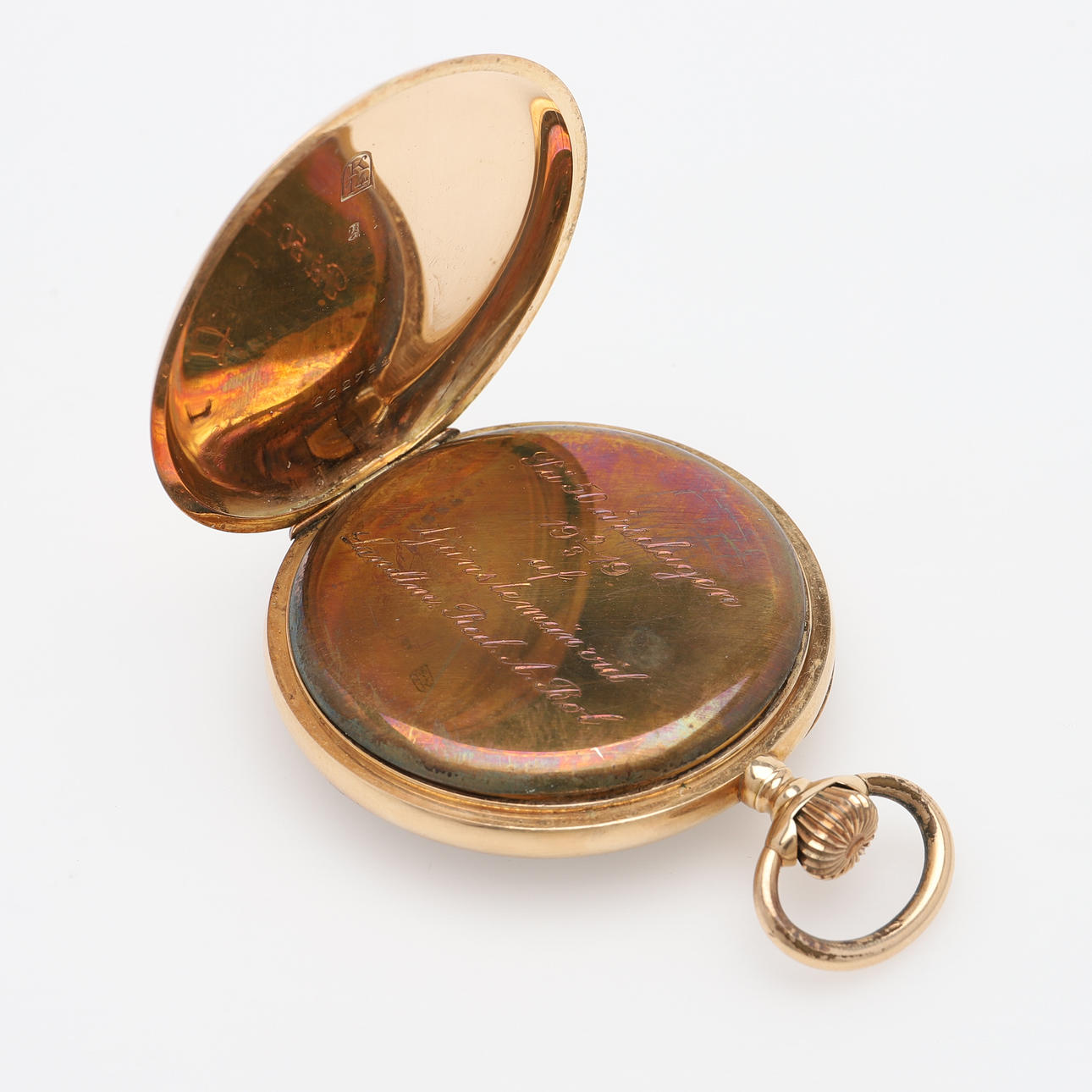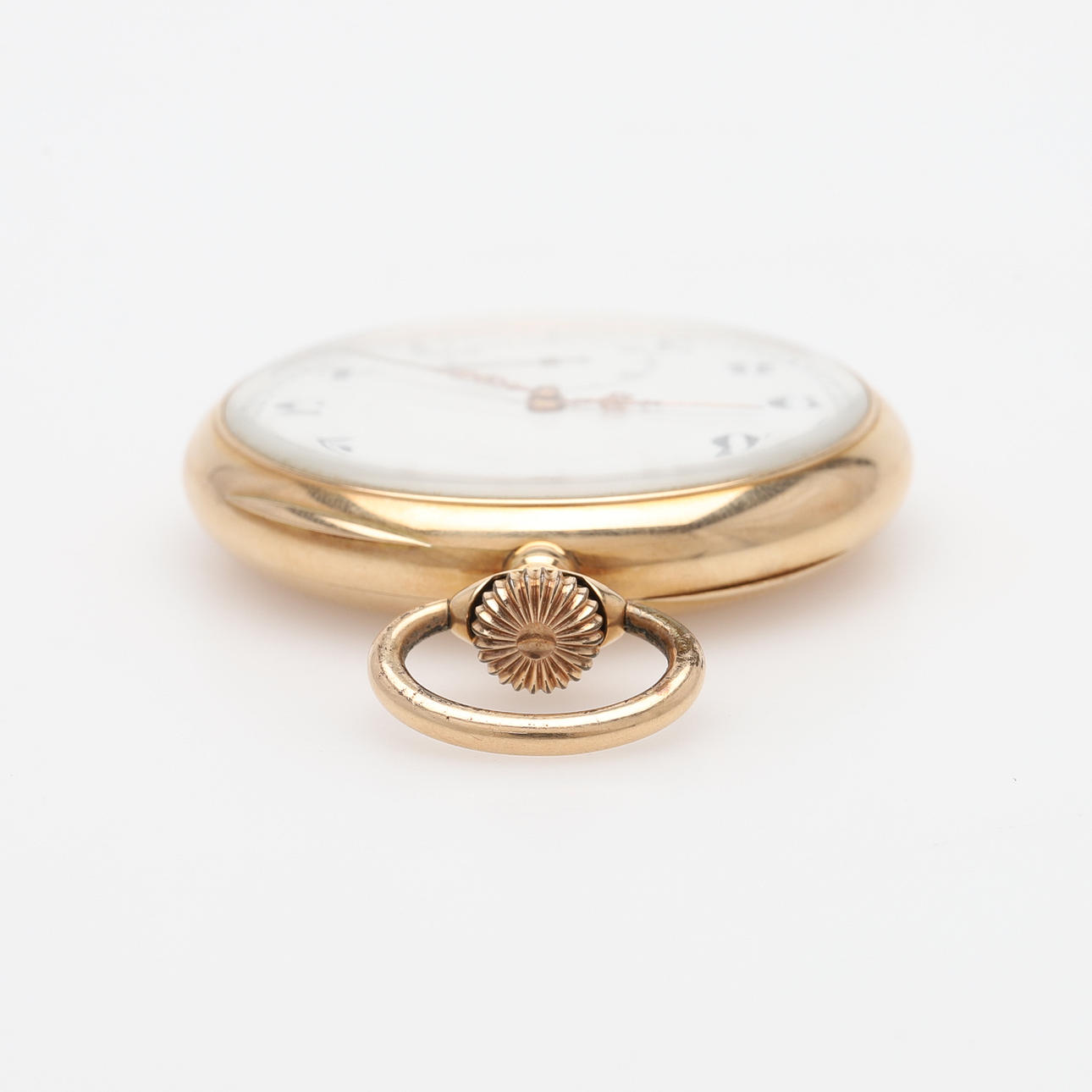 14k guld, med vit emaljjerad urtavla, uppdragskrona, oädelt innerlock, omkring 1920, diameter ca 50 mm, vikt 82,3 gram.
