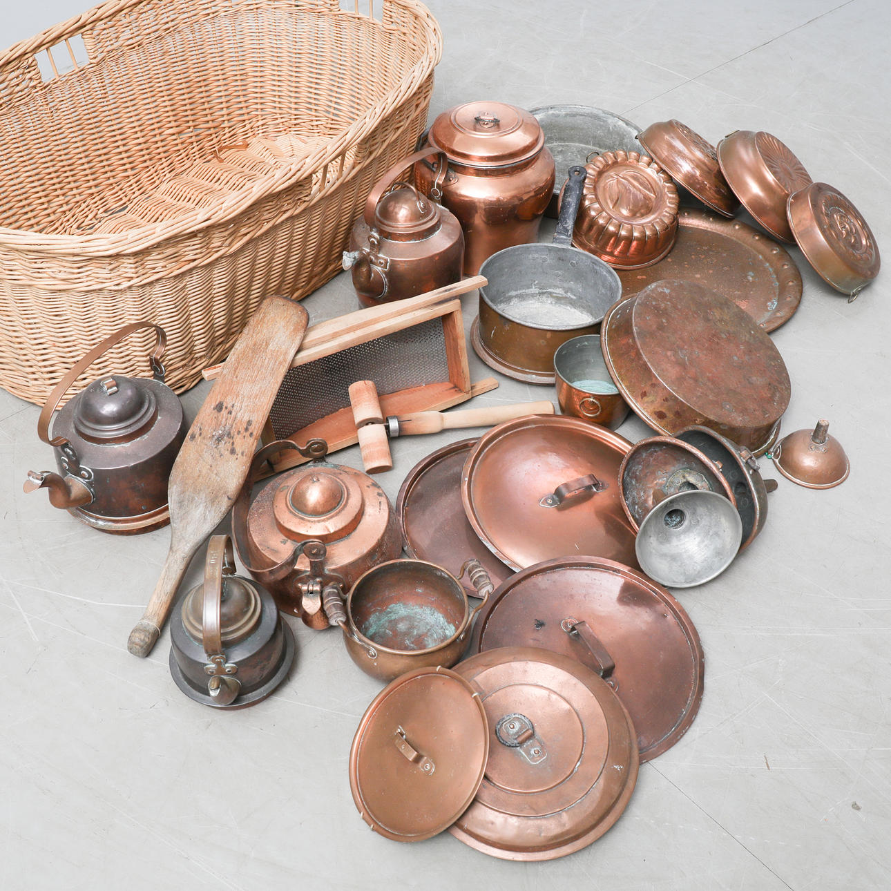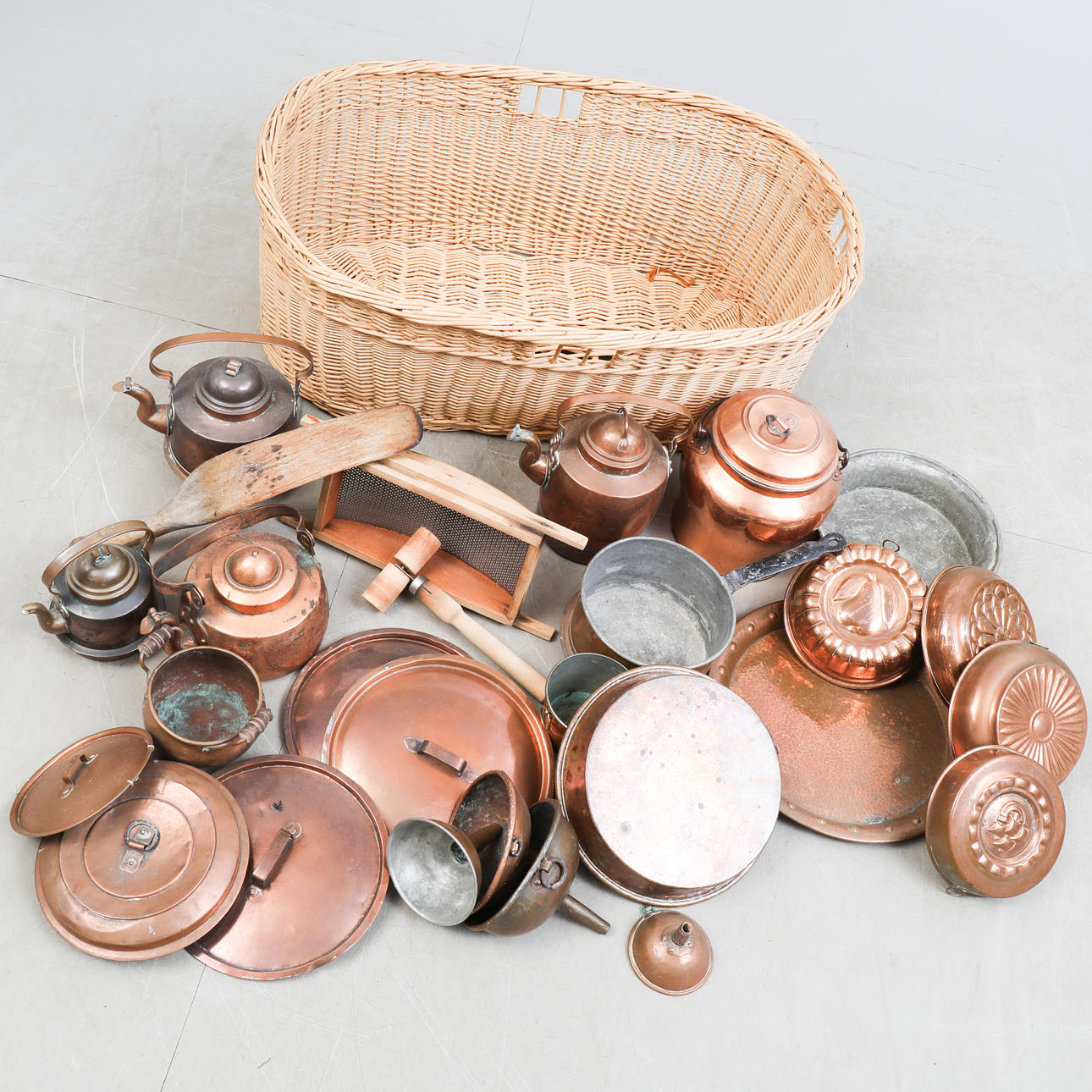 3143924. BRUKSFÖREMÅL, korg,koppar m.m.