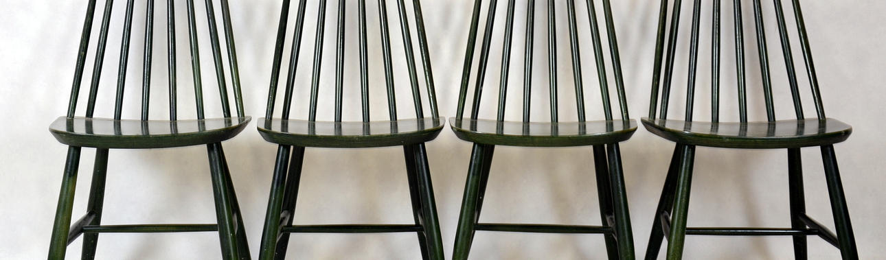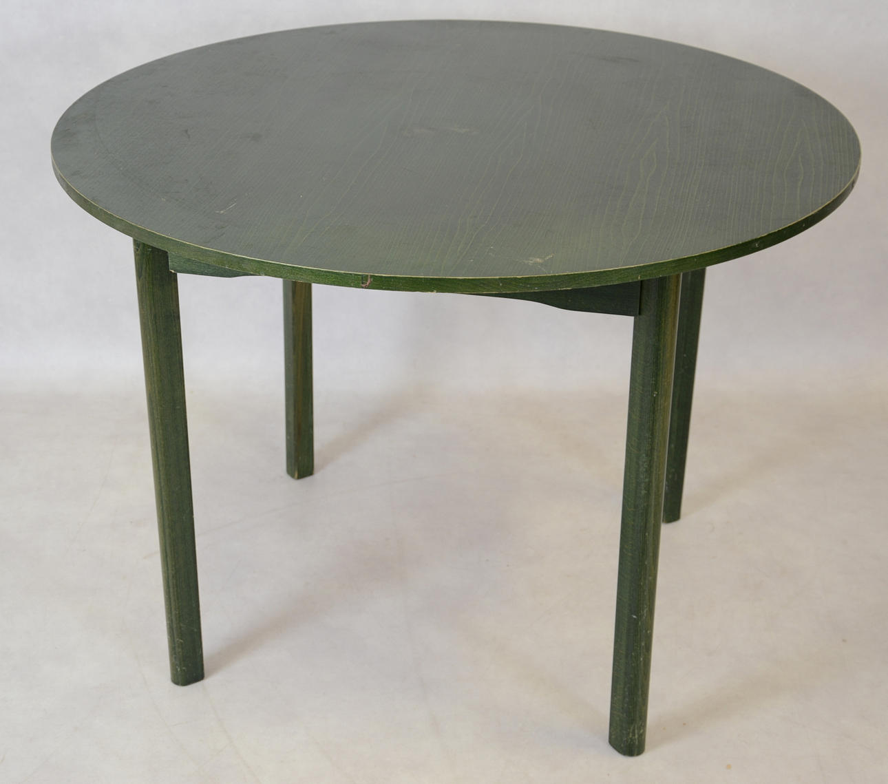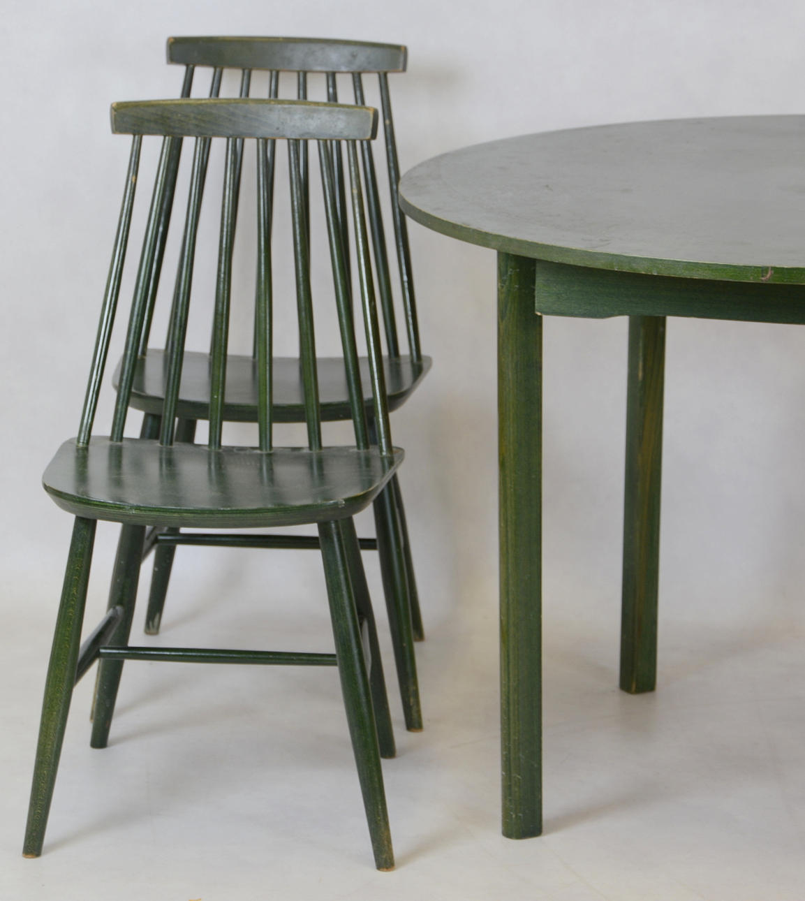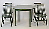 Enligt uppgift "tellus", etikett märkt, "ZMG 986613" Matgrupp bestående av bord och 4 stolar, grönt. Bord, diameter 105 cm.