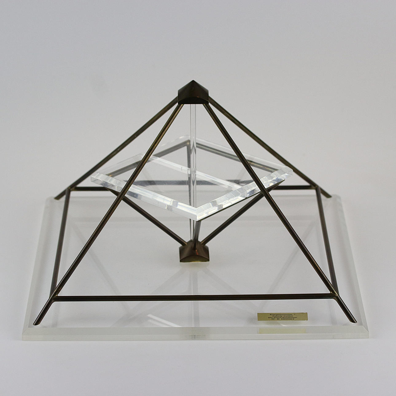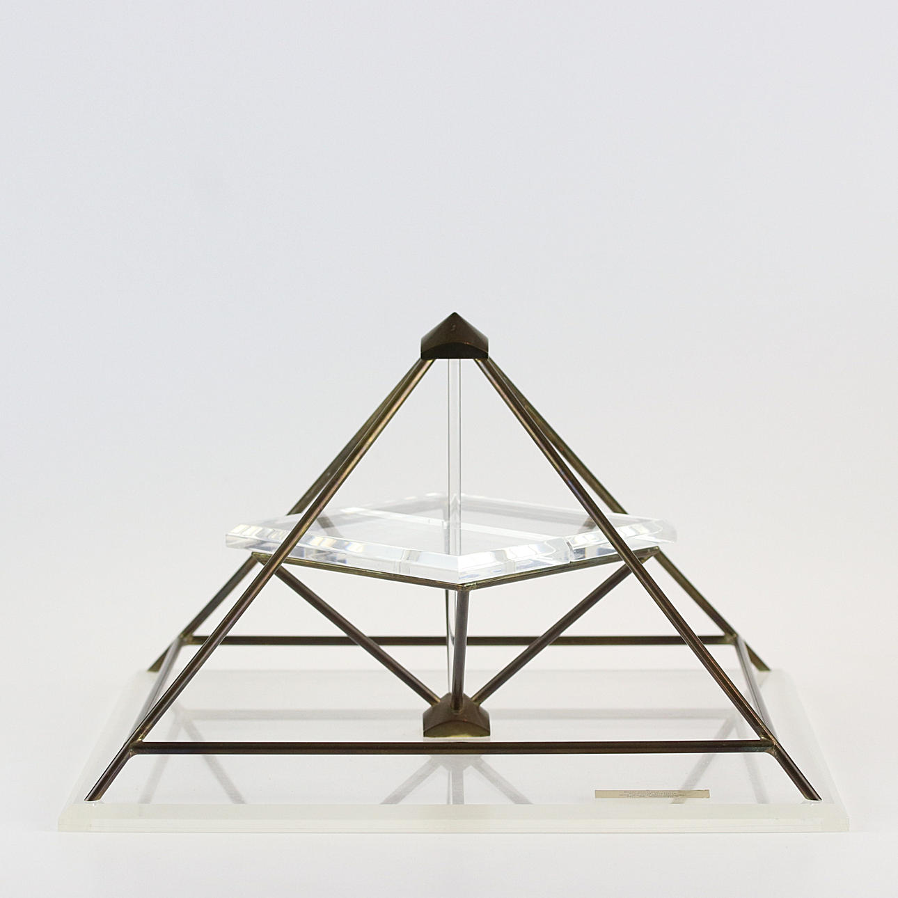 Höjd 19 cm, övre plexiplatta 13 x 13 cm, bottenplatta 30 x 30 cm.