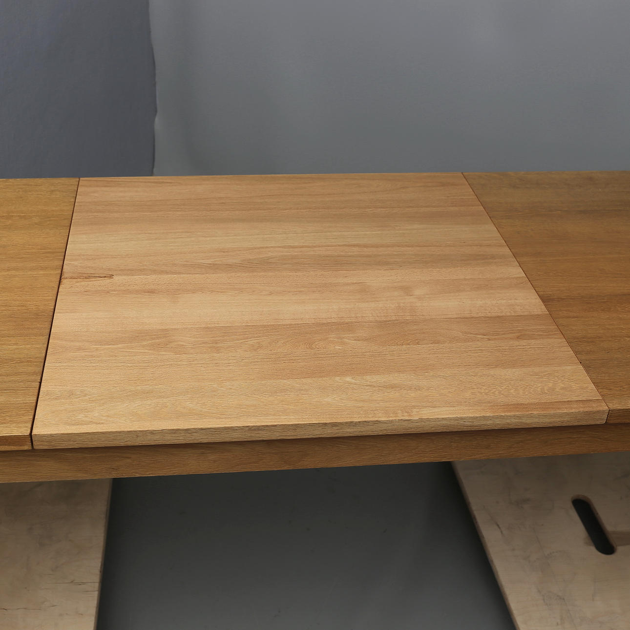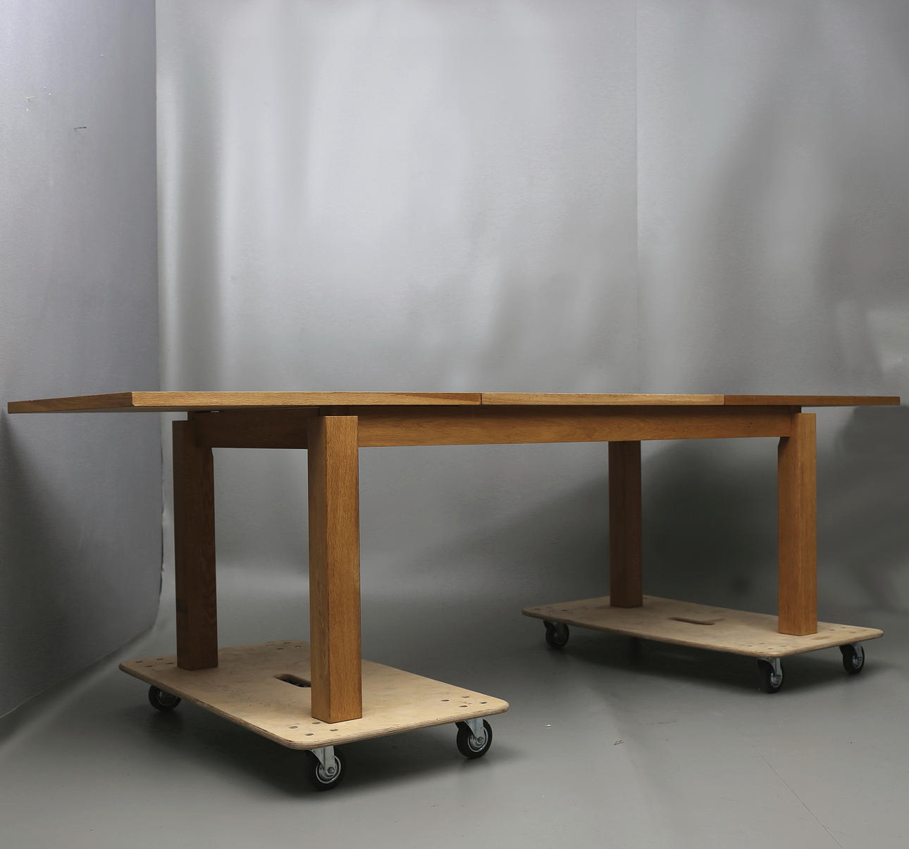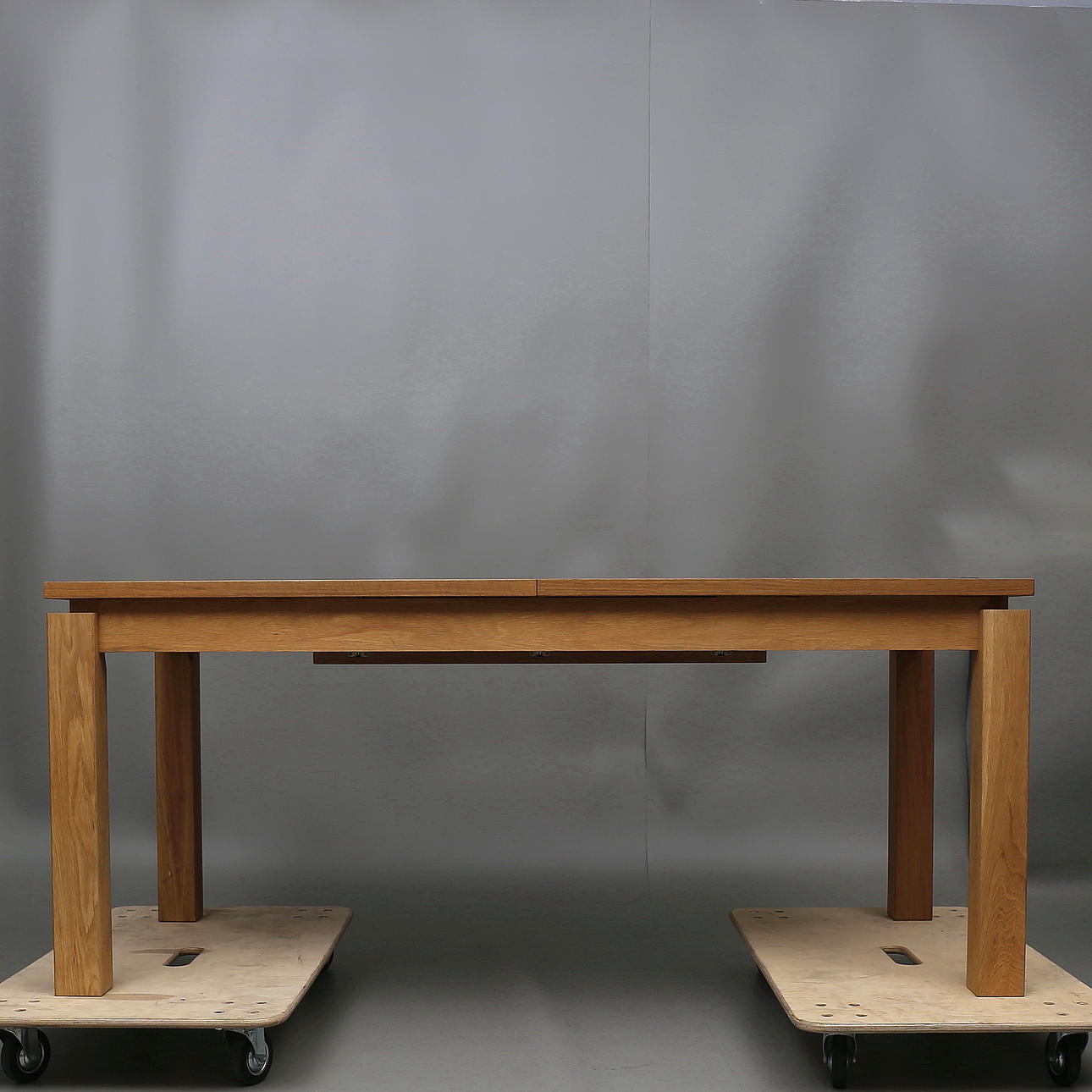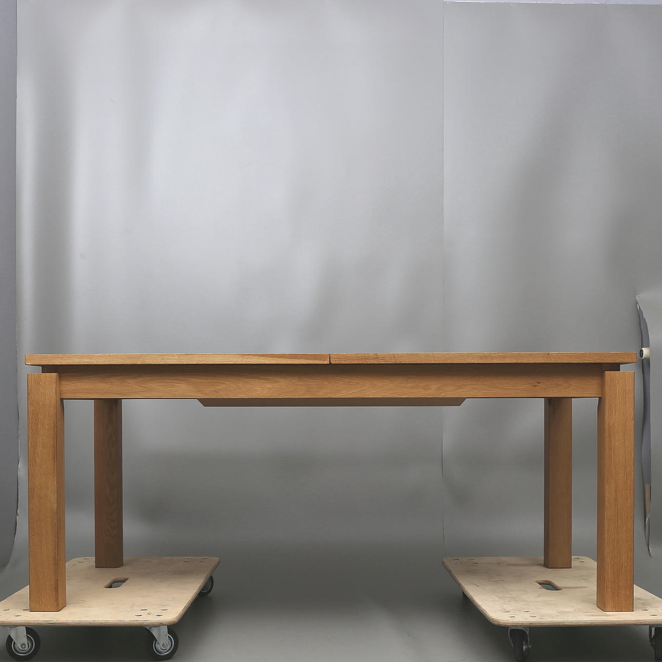 Matbord utfört i massiv ek med två iläggsskivor, bredd 180/270 cm, djup 90 cm, höjd 77 cm.