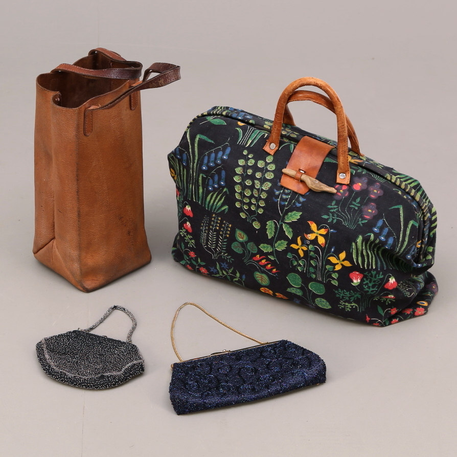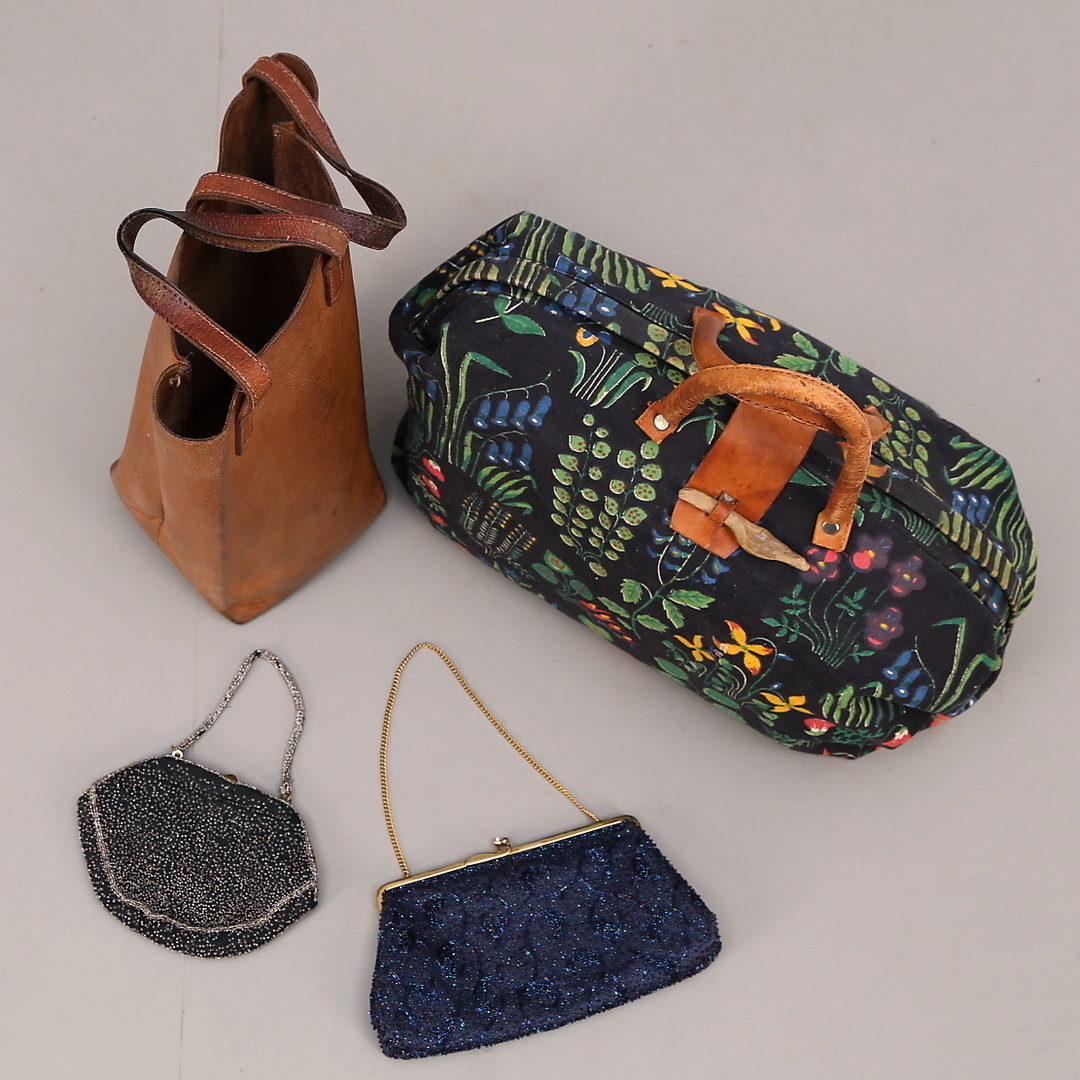 314676. VÄSKOR 4 st, tyg, läder, aftonväskor.