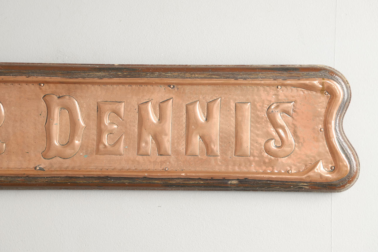 En stor handslagen kopparskylt för ”Edgar Dennis”, monterad på en träsockel och med metallkrokar för upphängning på baksidan. 92 cm lång, med 18,5 cm.