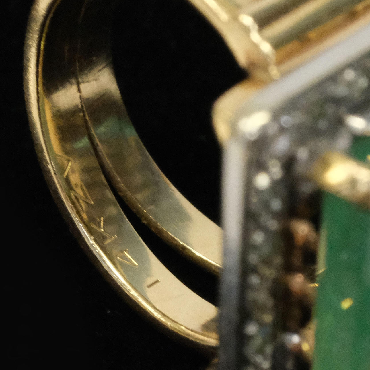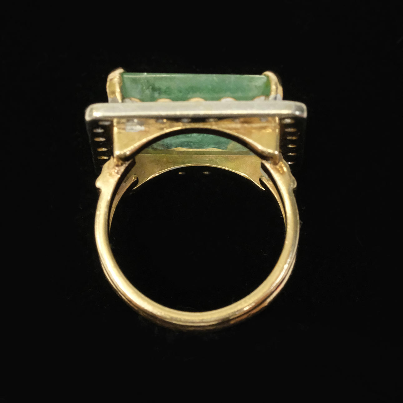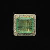 Fyrkantig form, mitten sten av ljus smaragd, mått ca 16,2x14,8x54,6mm, uppskattad vikt ca 8-9ct, omgiven av 26 diamanter, totalt ca 0,60ct.