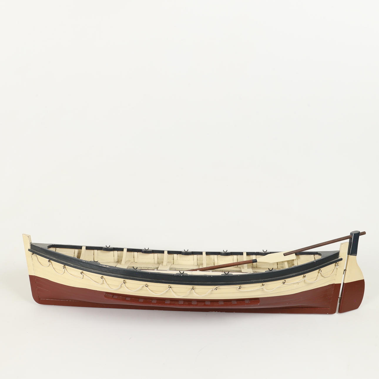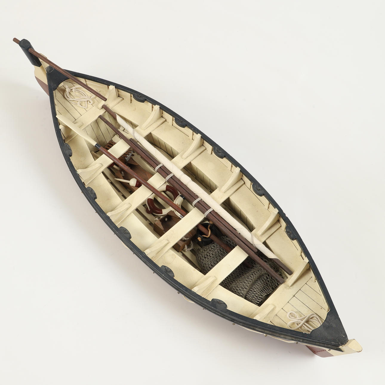 Slup för 5 roddare med segel och fisketillbehör Längd ca 80, bredd 25, höjd ca 13-18 cm.