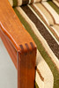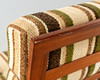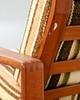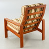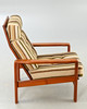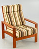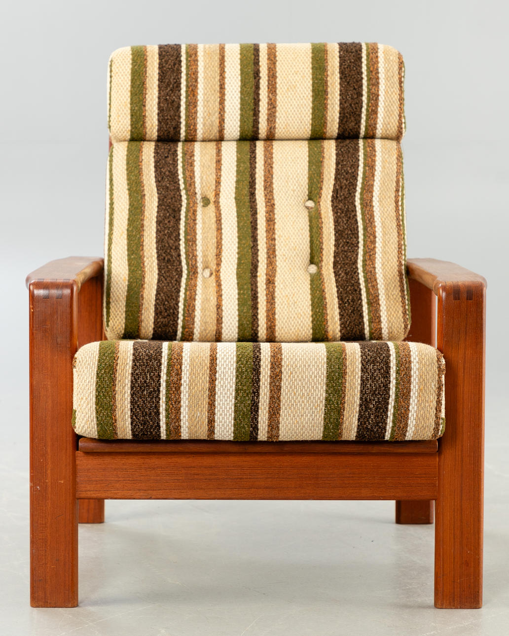 Teak fåtölj. Lösa kuddar med ulltygsöverdrag, beige-brungrön randig. Nackkudden är ordentligt fastsatt.