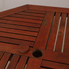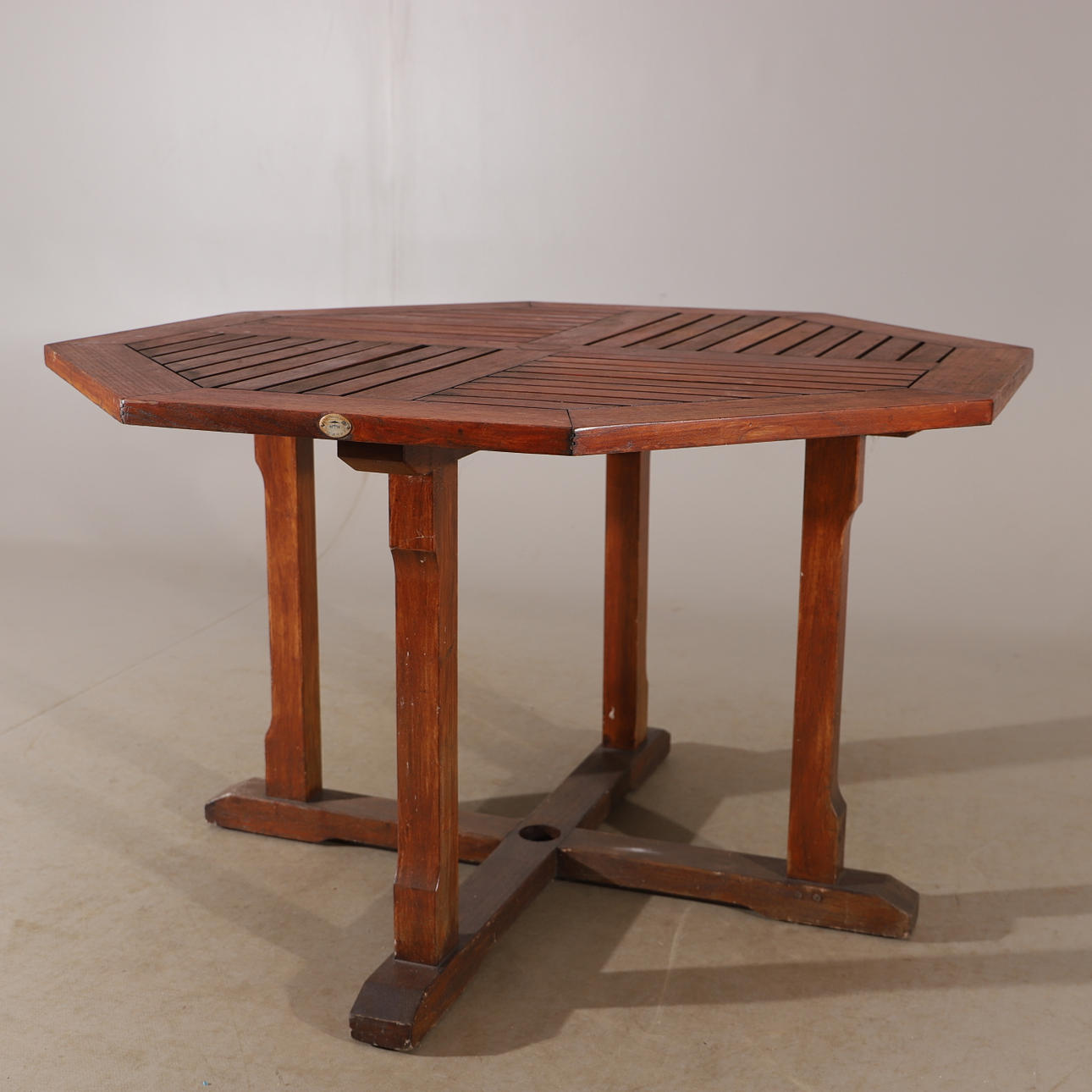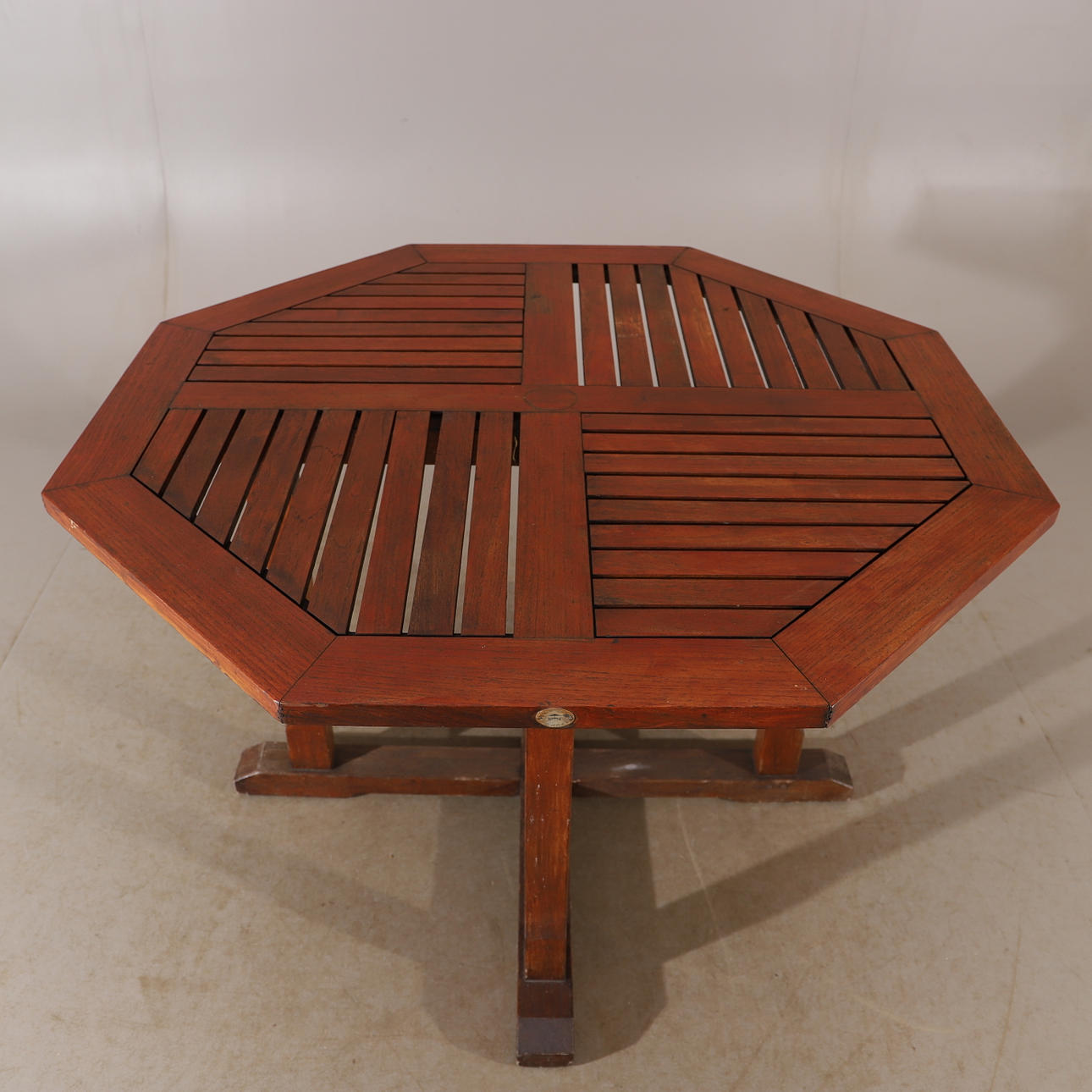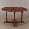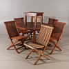 Bordets längd 120, bredd 120, höjd 75 cm. 6 stycken fällbara stolar samt ett mindre bord/pall.