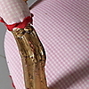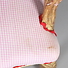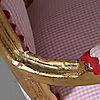 Bruksslitage, skador, lacksläpp, klädsel med fläckar, röda band fastlimmade på klädsel, senare omklädd, behövs limmas.