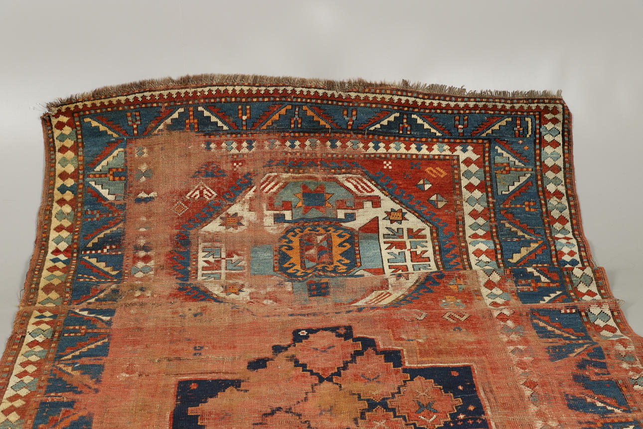 Mycket sliten, med mycket trådslitage, fläckar och blekning, kunde behövas med en rengöring. Missformad.