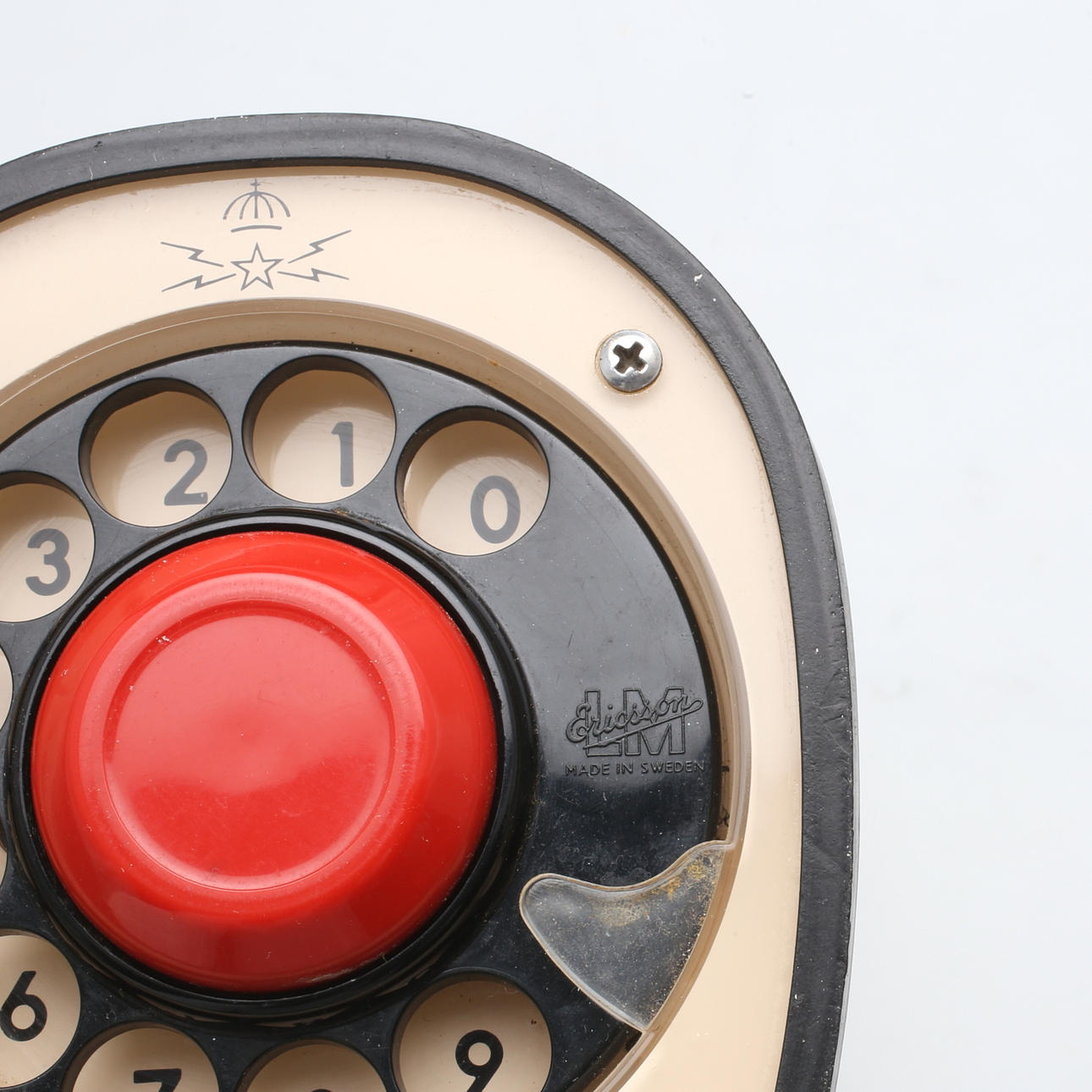 Med nummerskiva. Höjd 21 cm. Märkt LM Ericsson, Made in Sweden.