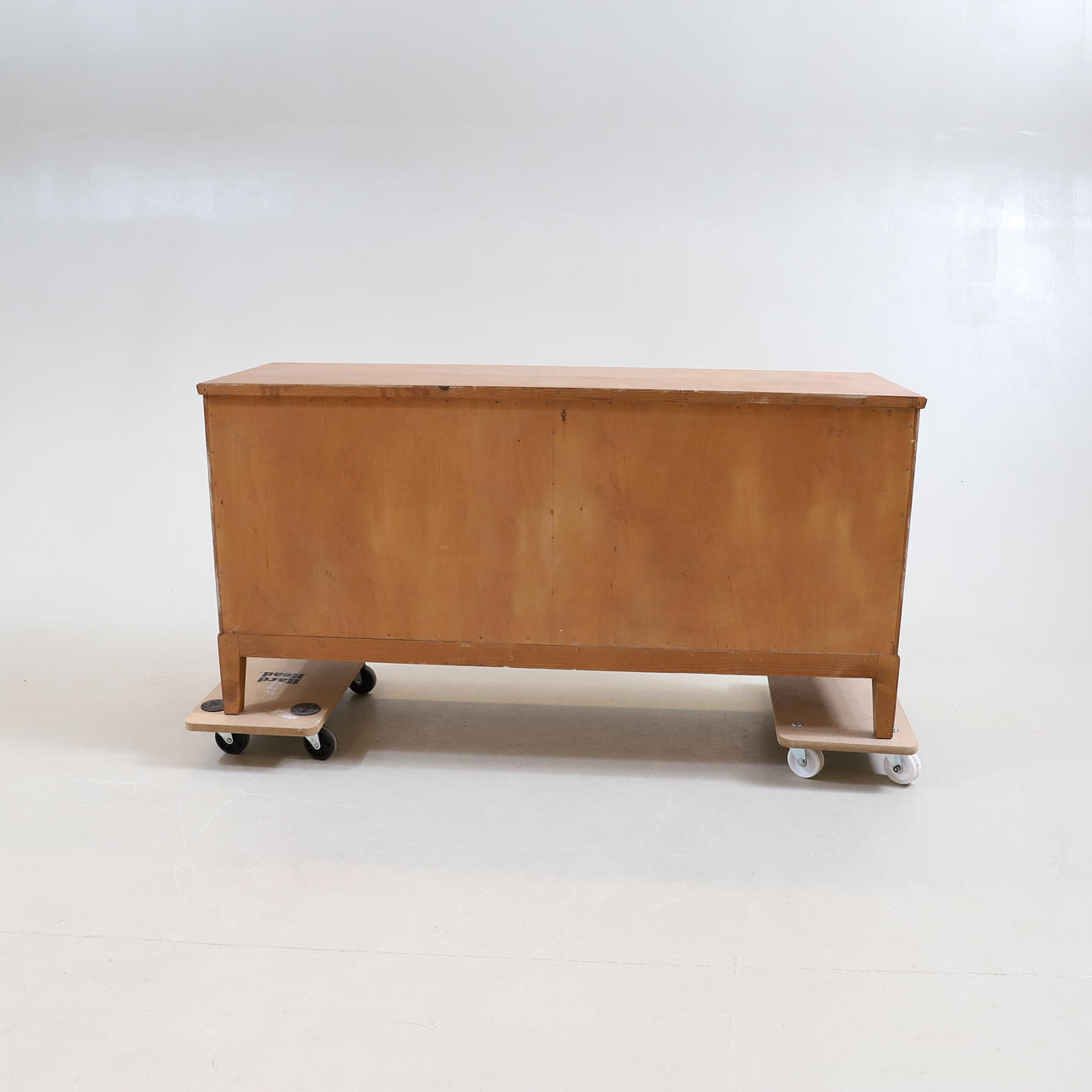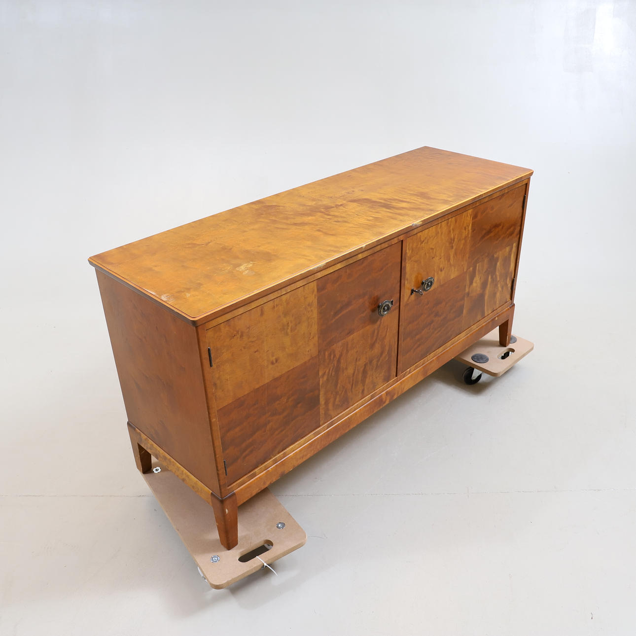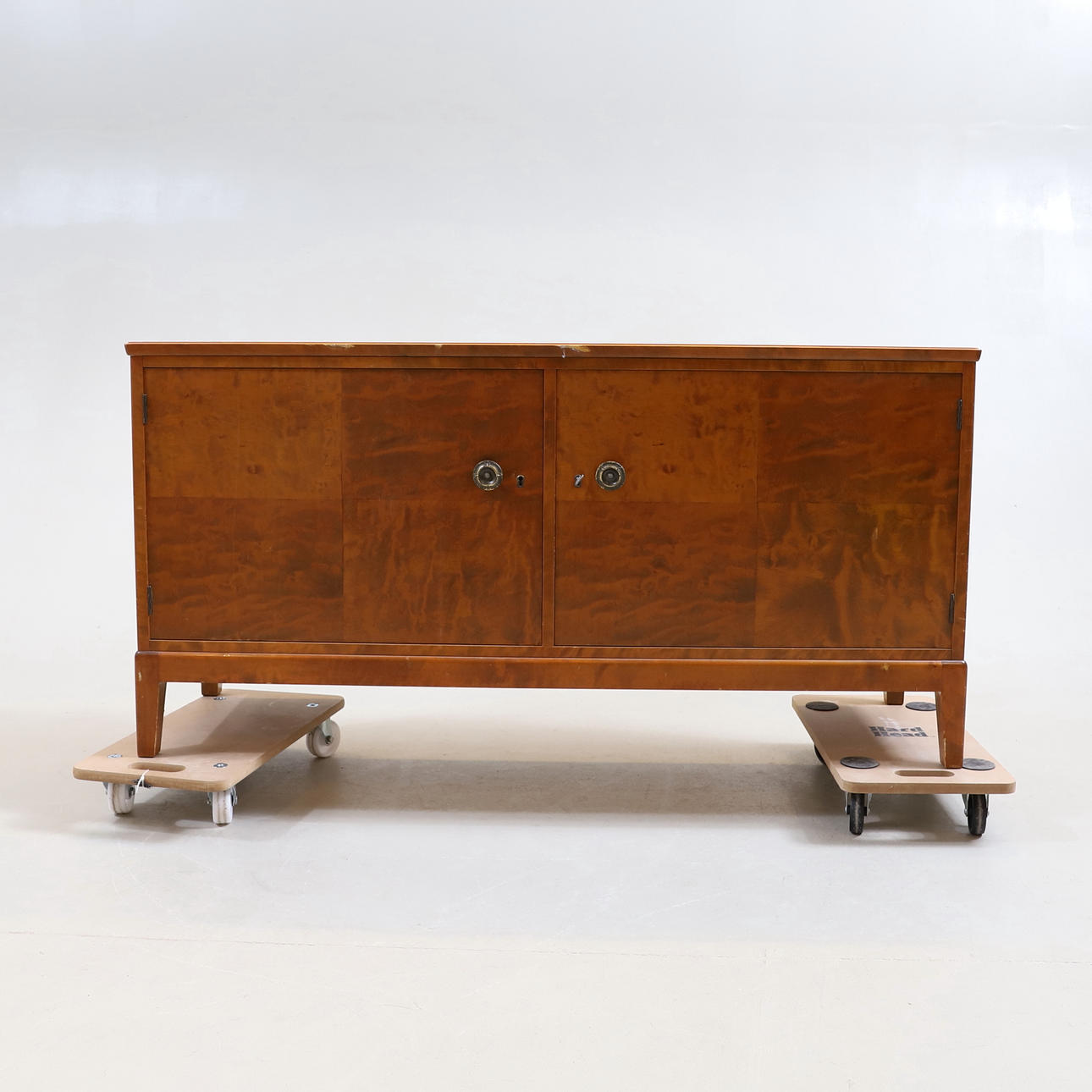 Fanerad i björk. Två dörrar med bakomvarande förvaring. Bredd ca 142 cm. Djup ca 47 cm. Höjd ca 72 cm.