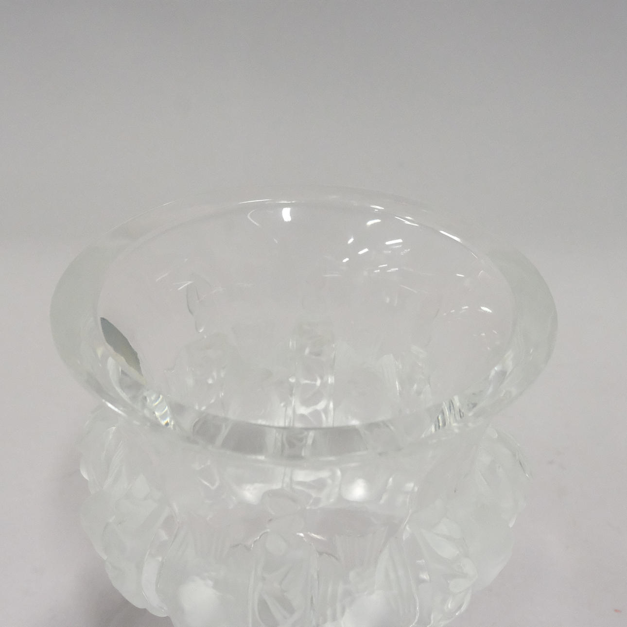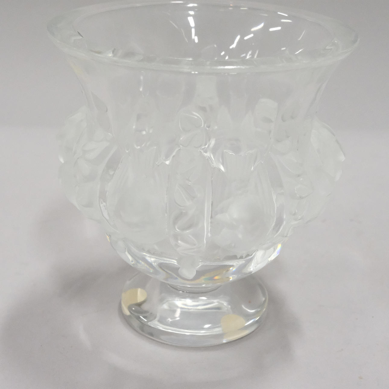 Vas, Dampierre. signerad Lalique France,dekor med fåglar, etikettmärkt, höjd 12,5cm, diameter 11,5cm.