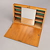Skåp med nedfällbar klaff, fällbar spegel, hyllinredning.