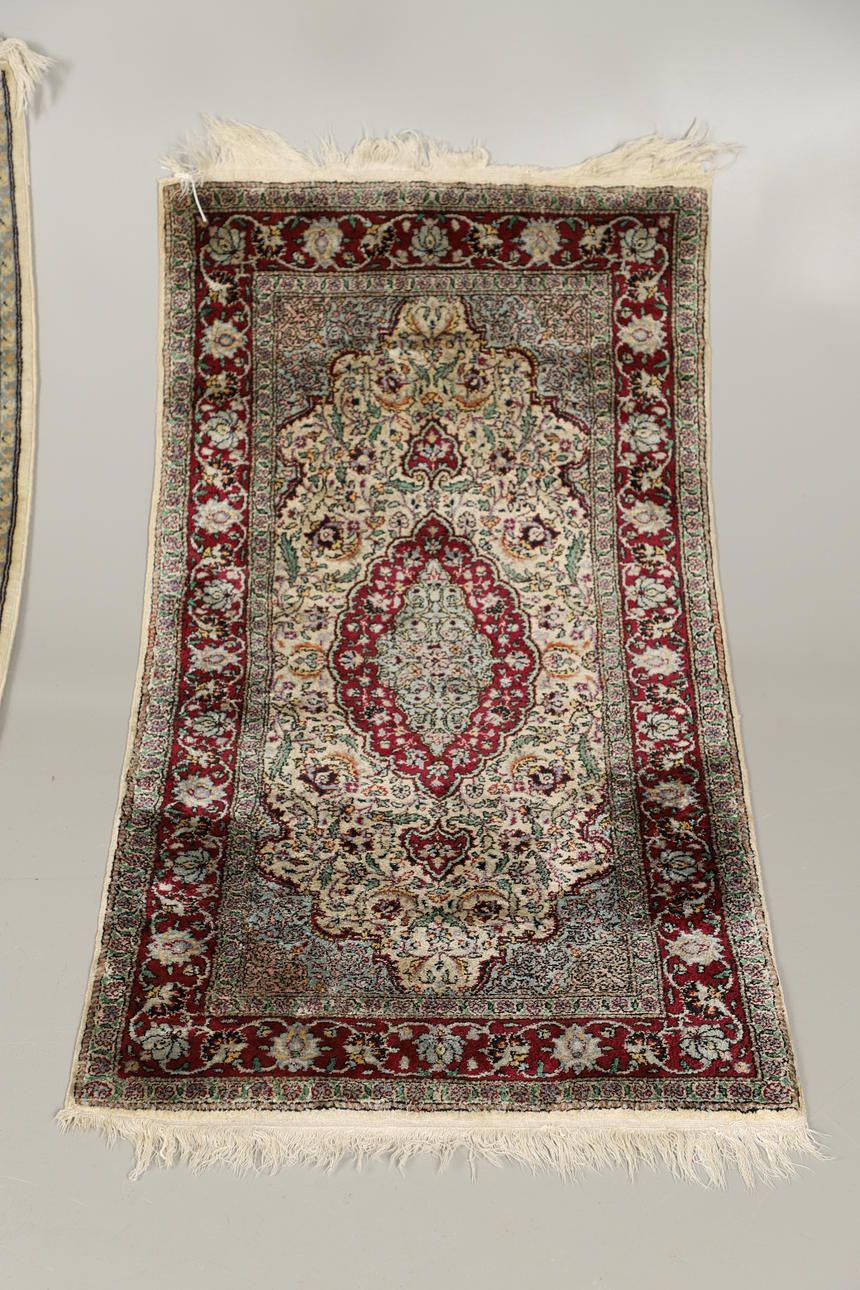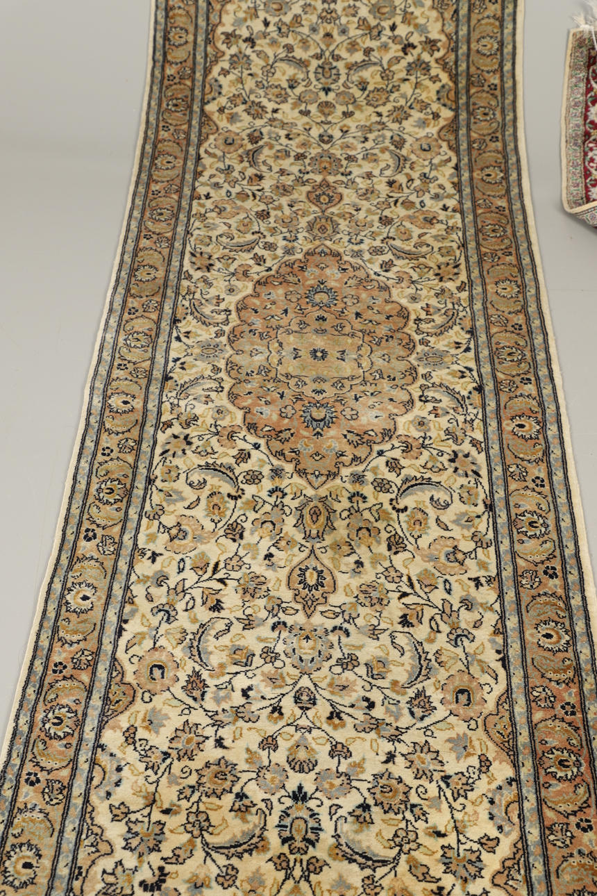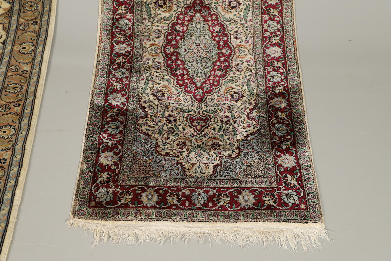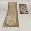 Elfenbensfältet av vinstockar runt en spetsad medaljong inramad av spandrels och blommiga bårder, 251 cm x 75 cm, tillsammans med en indisk sidenmatta, andra halvan C20th, elfenbensfältet centrerat av en auberginmedaljong inramad av spandrels och blommiga bårder, 122 cm x 60 cm (2).