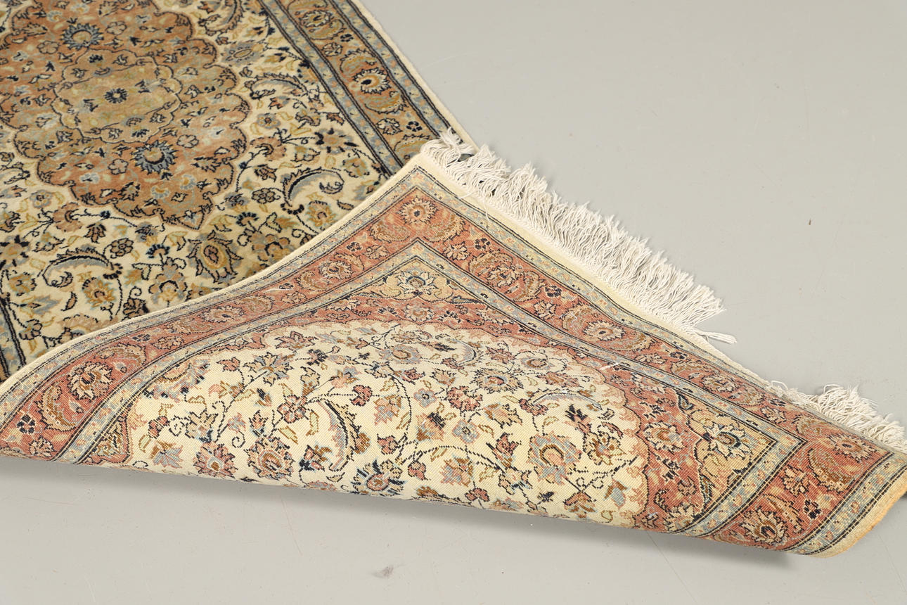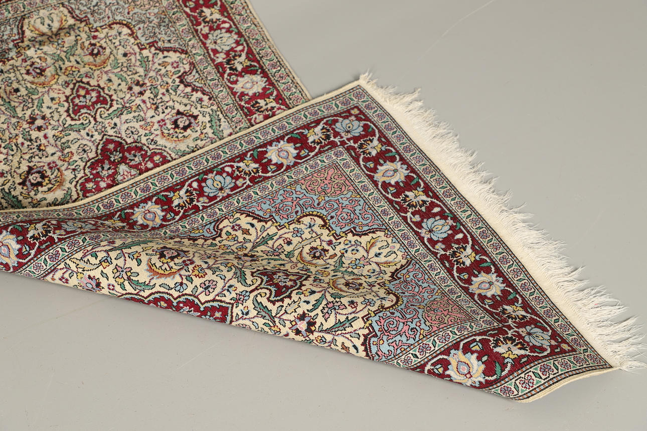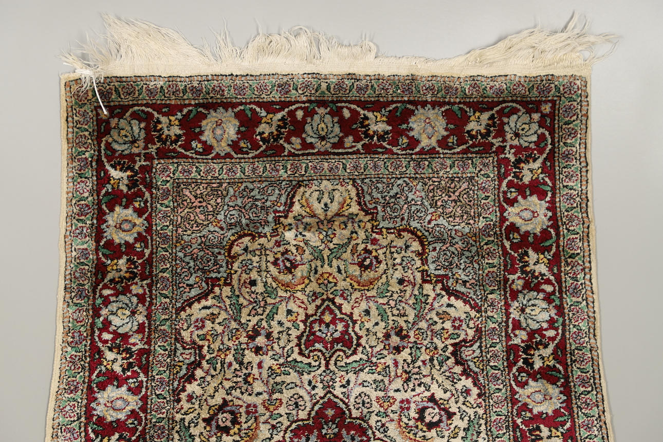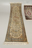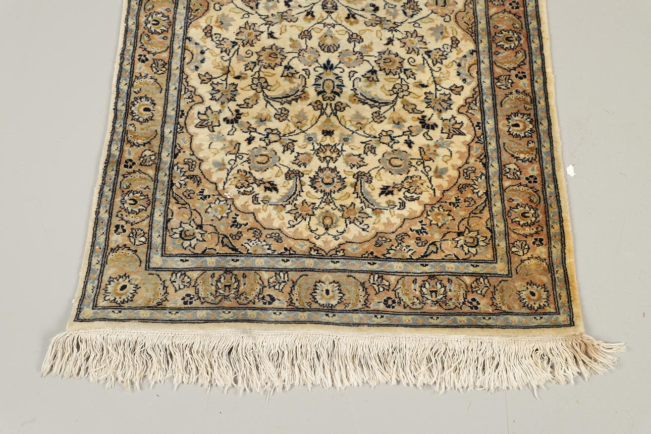 Elfenbensfältet av vinstockar runt en spetsad medaljong inramad av spandrels och blommiga bårder, 251 cm x 75 cm, tillsammans med en indisk sidenmatta, andra halvan C20th, elfenbensfältet centrerat av en auberginmedaljong inramad av spandrels och blommiga bårder, 122 cm x 60 cm (2).