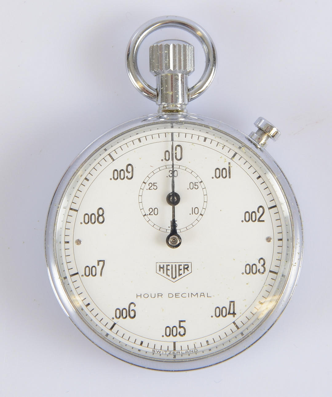 Stoppur, Heuer med stål. Vit urtavla med siffror, andra och minutvisaren.