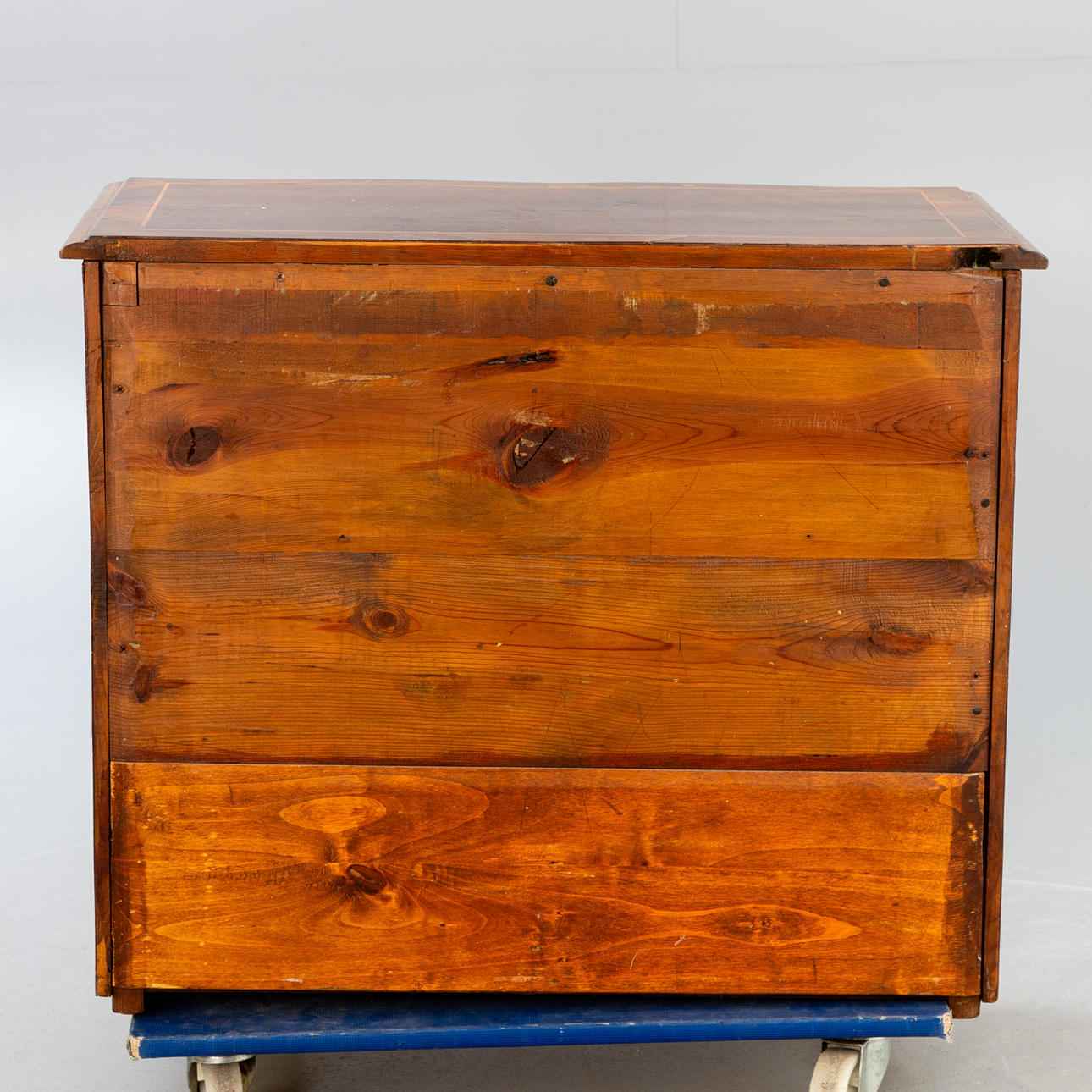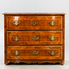 Rektangulär kropp med tre lådor fram, två lådor, med allroundbandinlägg, på kvadratfot och lockigt utskuren ram. Något utskjutande täckplatta. mässing beslag.