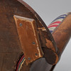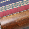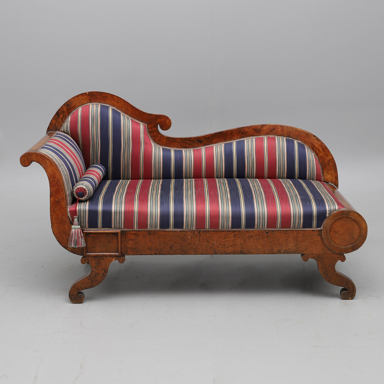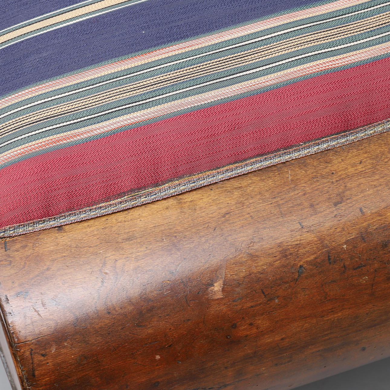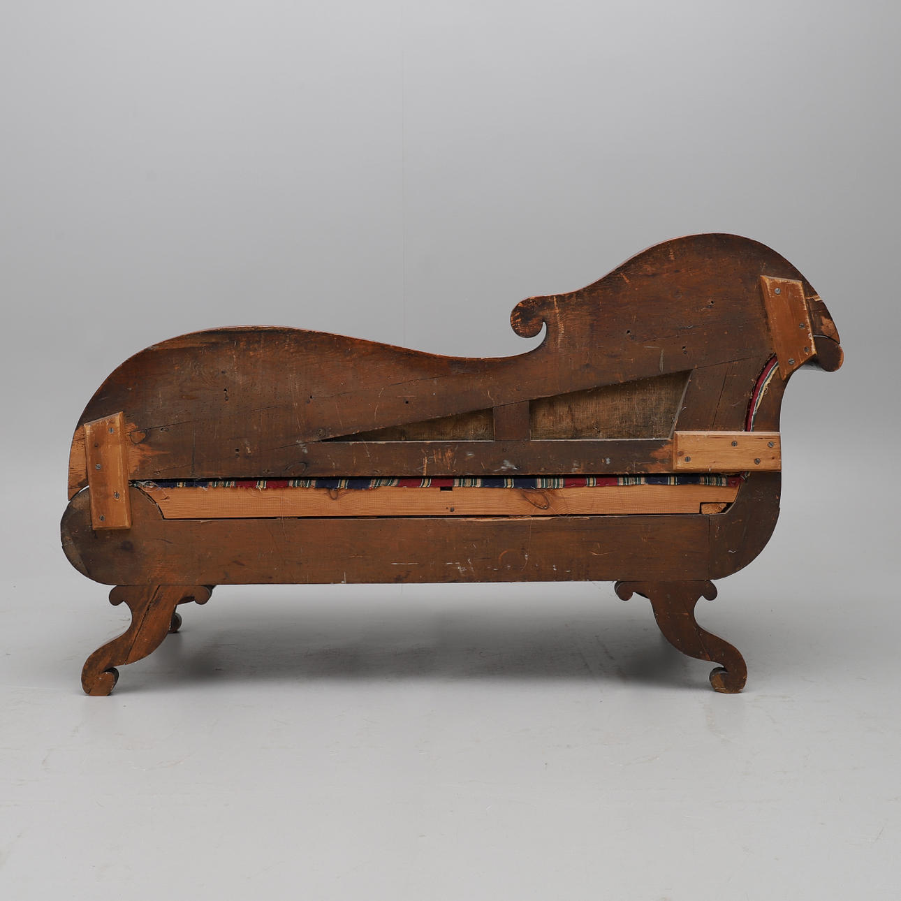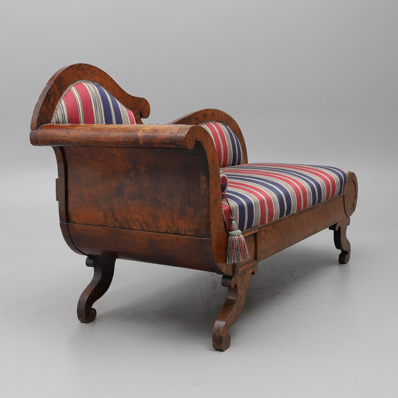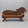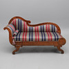 Svängd rygg, fanerad, fast stoppad sits och rygg, höjd 95 cm, längd ca 160 cm.