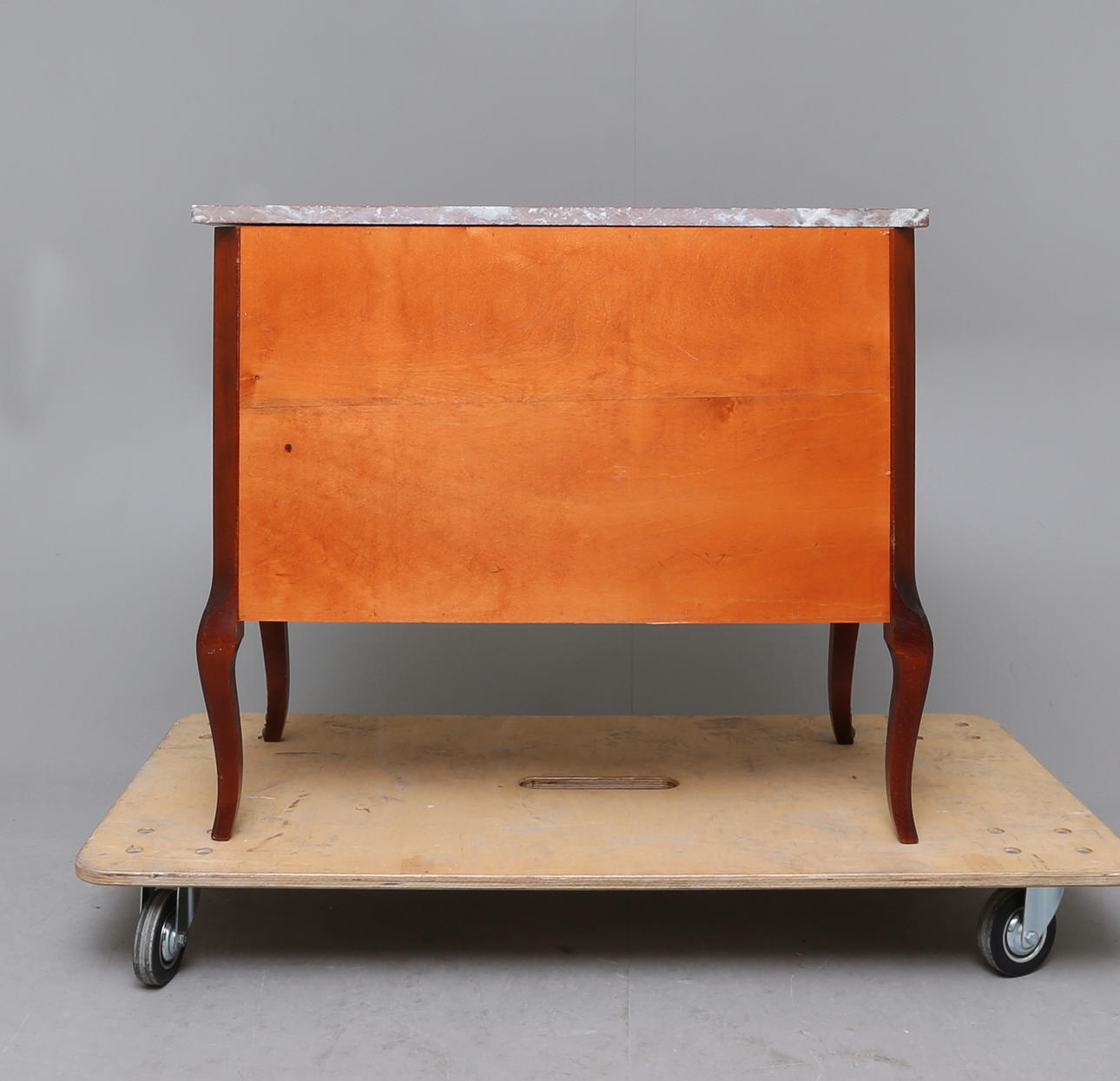 Fanerad med mahogny samt intarsia, lös marmorskiva, beslag i brons. Längd: 87, Bredd: 41, Höjd: 73 cm.