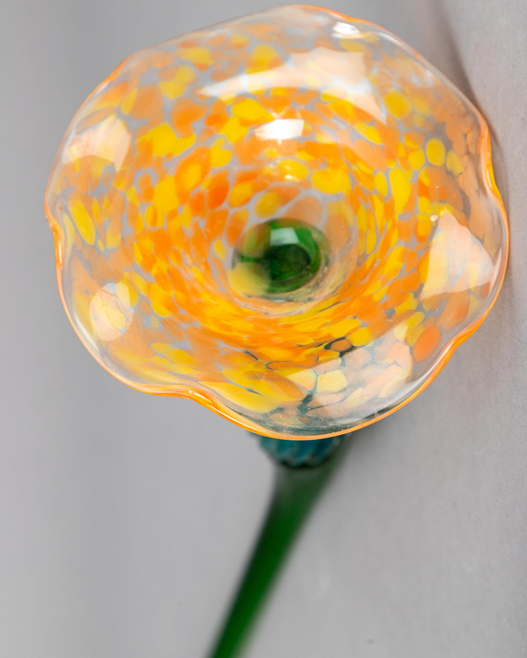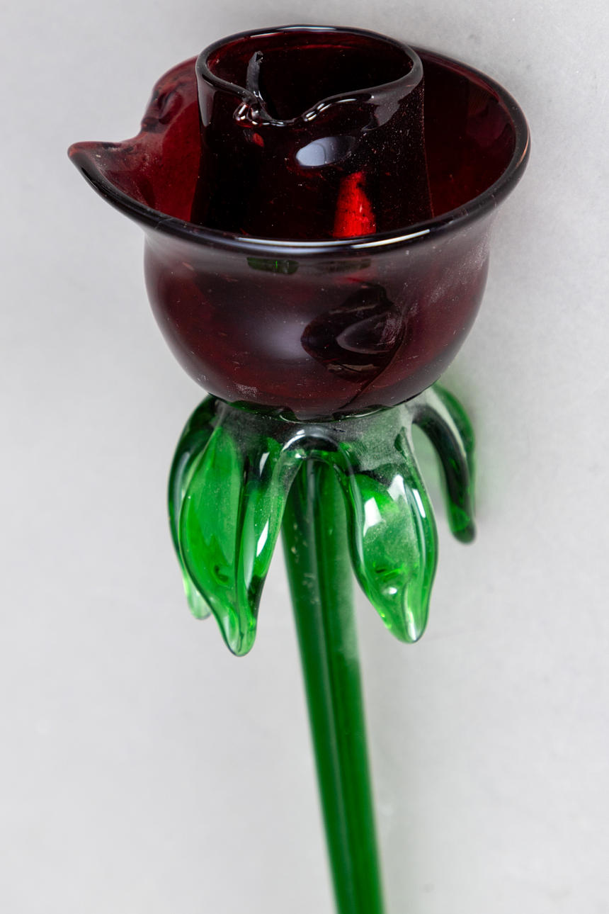 Glasföremål. Olika blommor på en grön stam, en på en gul stam. Signerad ”P.B.98” ca. Höjd 50 - 65 cm.