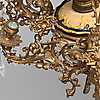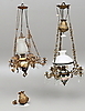 Taklampa med 6 ljushållare, saknar passande lampkupa höjd 120 cm, diameter 60 cm. Taklampa med 6 ljusarmar varav en arm gått av. 2 lampkupor diameter 30 respektive 17 cm.