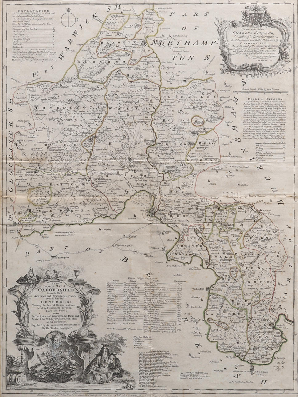 handfärgad graverad karta, i en Hogarth-ram, 45 cm x 37,5 cm totalt, och Thomas Kitchin - En ny karta över Oxfordshire, handfärgad graverad karta, 72 cm x 53 cm, i kortfäste och klämram (2).