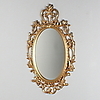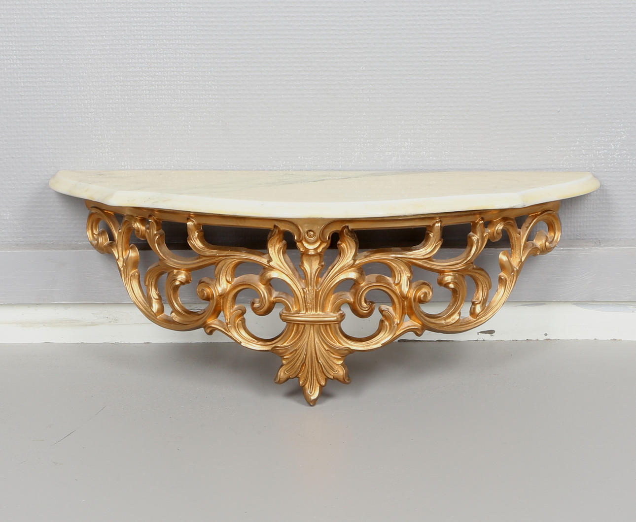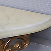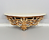 Guldlackerat plast. Väggkonsol med marmorskiva. Spegelglasets- mått: 48 x 32,5 cm. Väggkonsol, längd 58, bredd 22, höjd 20,5 cm.